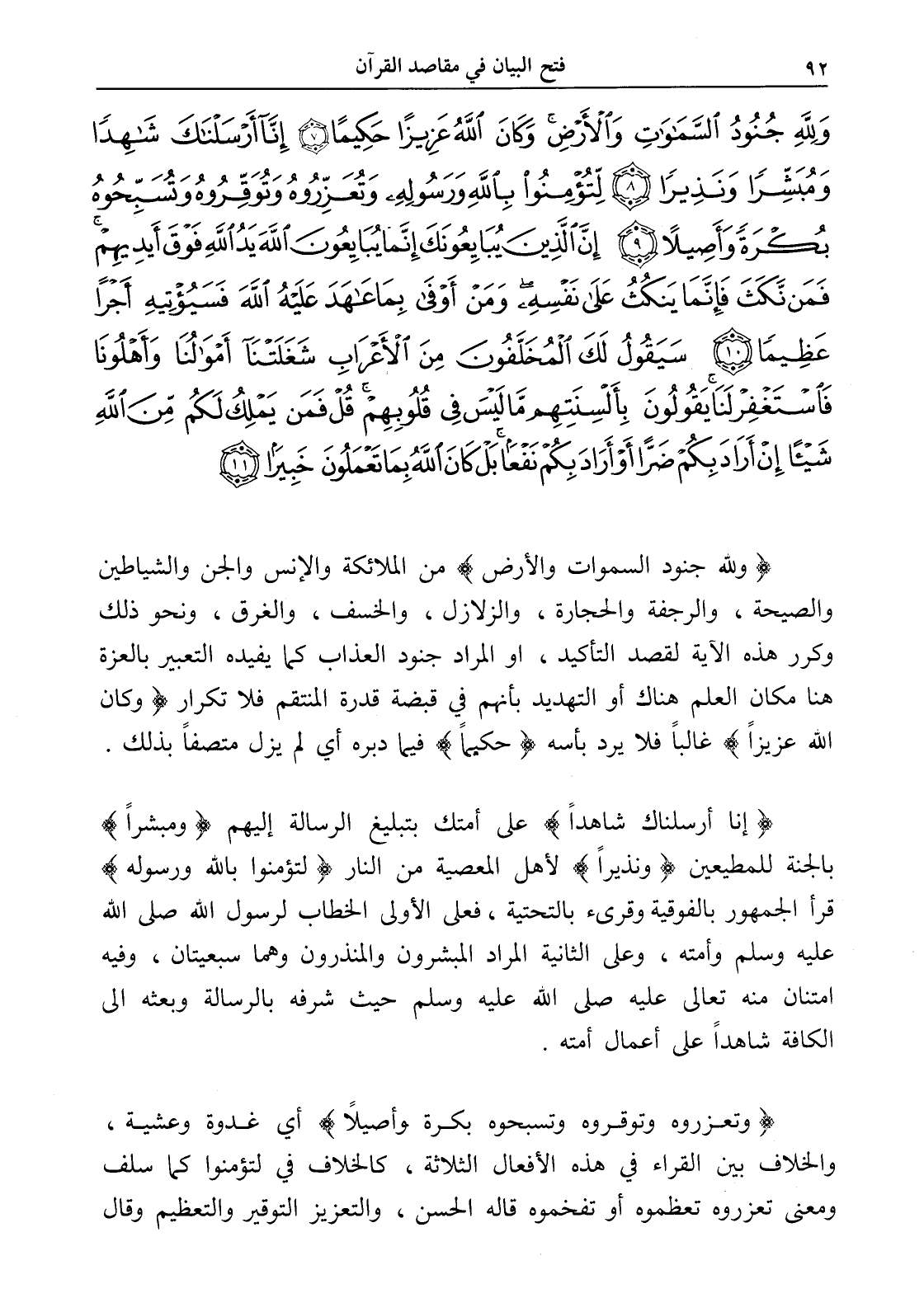 وَلِلَّهِ جُنُودُ السَّمَاوَاتِ وَالْأَرْضِ وَكَانَ اللَّهُ عَزِيزًا حَكِيمًا (7) إِنَّا أَرْسَلْنَاكَ شَاهِدًا وَمُبَشِّرًا وَنَذِيرًا (8) لِتُؤْمِنُوا بِاللَّهِ وَرَسُولِهِ وَتُعَزِّرُوهُ وَتُوَقِّرُوهُ وَتُسَبِّحُوهُ بُكْرَةً وَأَصِيلًا (9) إِنَّ الَّذِينَ يُبَايِعُونَكَ إِنَّمَا يُبَايِعُونَ اللَّهَ يَدُ اللَّهِ فَوْقَ أَيْدِيهِمْ فَمَنْ نَكَثَ فَإِنَّمَا يَنْكُثُ عَلَى نَفْسِهِ وَمَنْ أَوْفَى بِمَا عَاهَدَ عَلَيْهُ اللَّهَ فَسَيُؤْتِيهِ أَجْرًا عَظِيمًا (10) سَيَقُولُ لَكَ الْمُخَلَّفُونَ مِنَ الْأَعْرَابِ شَغَلَتْنَا أَمْوَالُنَا وَأَهْلُونَا فَاسْتَغْفِرْ لَنَا يَقُولُونَ بِأَلْسِنَتِهِمْ مَا لَيْسَ فِي قُلُوبِهِمْ قُلْ فَمَنْ يَمْلِكُ لَكُمْ مِنَ اللَّهِ شَيْئًا إِنْ أَرَادَ بِكُمْ ضَرًّا أَوْ أَرَادَ بِكُمْ نَفْعًا بَلْ كَانَ اللَّهُ بِمَا تَعْمَلُونَ خَبِيرًا (11)