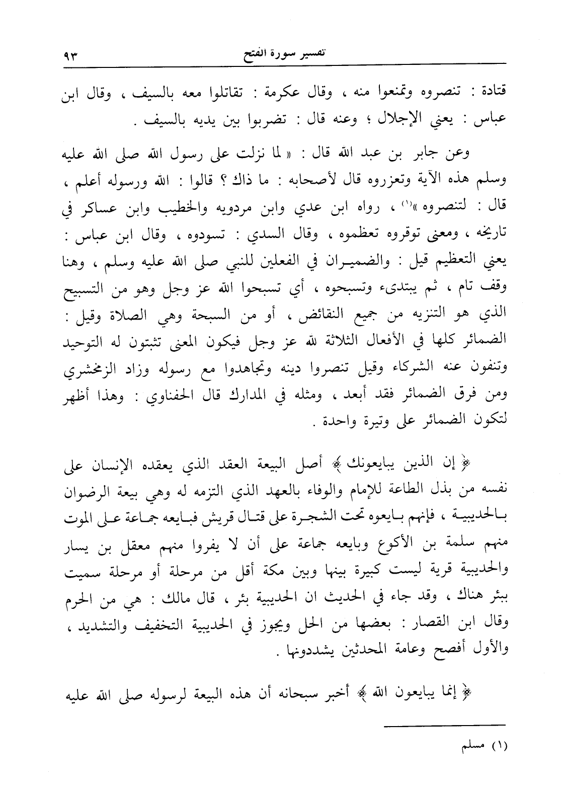 (إن الذين يبايعونك) أصل البيعة العقد الذي يعقده الإنسان على نفسه من بذل الطاعة للإمام والوفاء بالعهد الذي التزمه له وهي بيعة الرضوان بالحديبية، فإنهم بايعوه تحت الشجرة على قتال قريش فبايعه جماعة على الموت منهم سلمة بن الأكوع وبايعه جماعة على أن لا يفروا منهم معقل بن يسار والحديبية قرية ليست كبيرة بينها وبين مكة أقل من مرحلة أو مرحلة سميت ببئر هناك، وقد جاء في الحديث أن الحديبية بئر، قال مالك: هي من الحرم وقال ابن القصار: بعضها من الحل ويجوز في الحديبية التخفيف والتشديد، والأول أفصح وعامة المحدثين يشددونها.