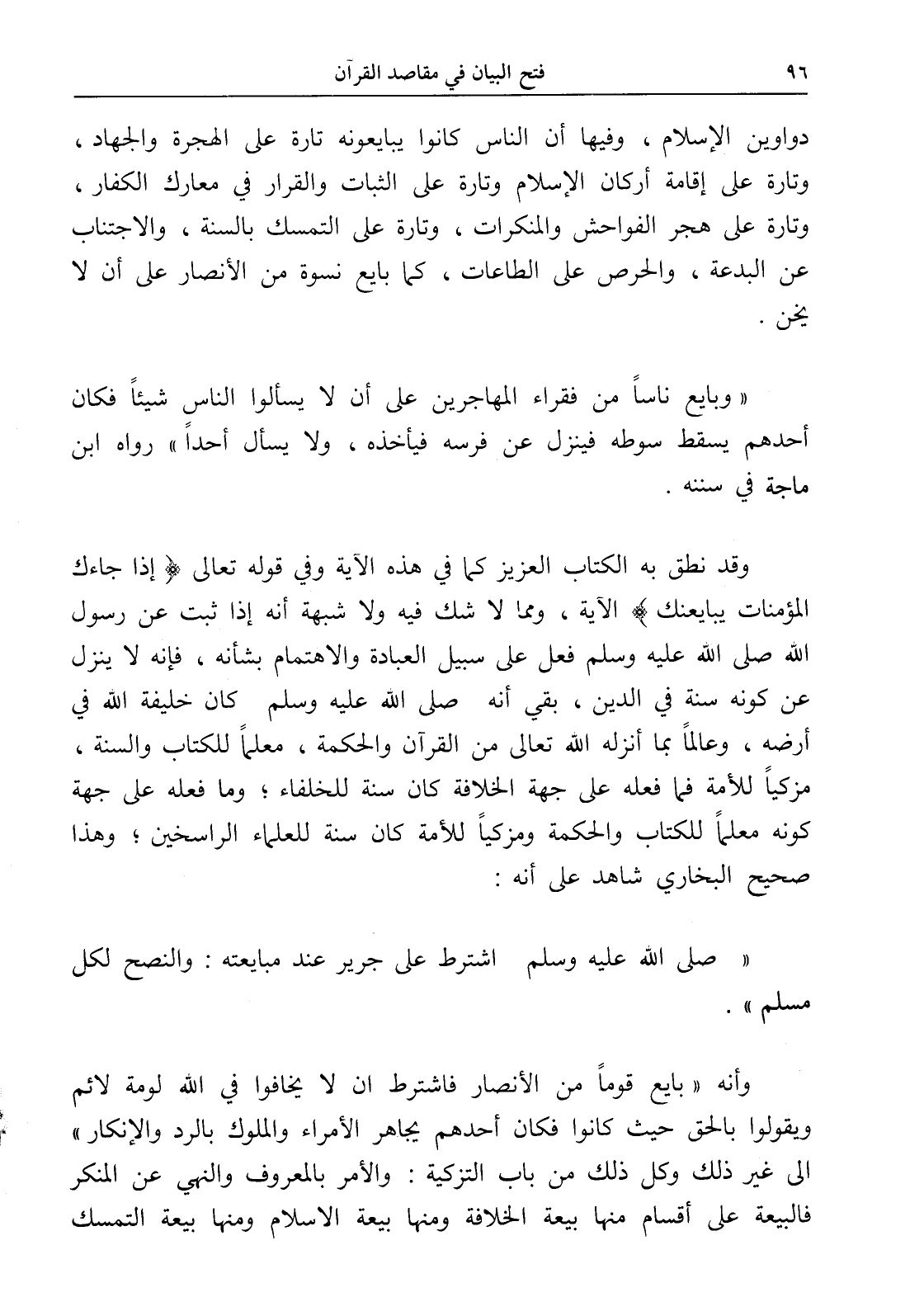 دواوين الإسلام، وفيها أن الناس كانوا يبايعونه تارة على الهجرة والجهاد، وتارة على إقامة أركان الإسلام وتارة على الثبات والقرار في معارك الكفار، وتارة على هجر الفواحش والمنكرات، وتارة على التمسك بالسنة، والاجتناب عن البدعة، والحرص على الطاعات، كما بايع نسوة من الأنصار على أن لا يخن.