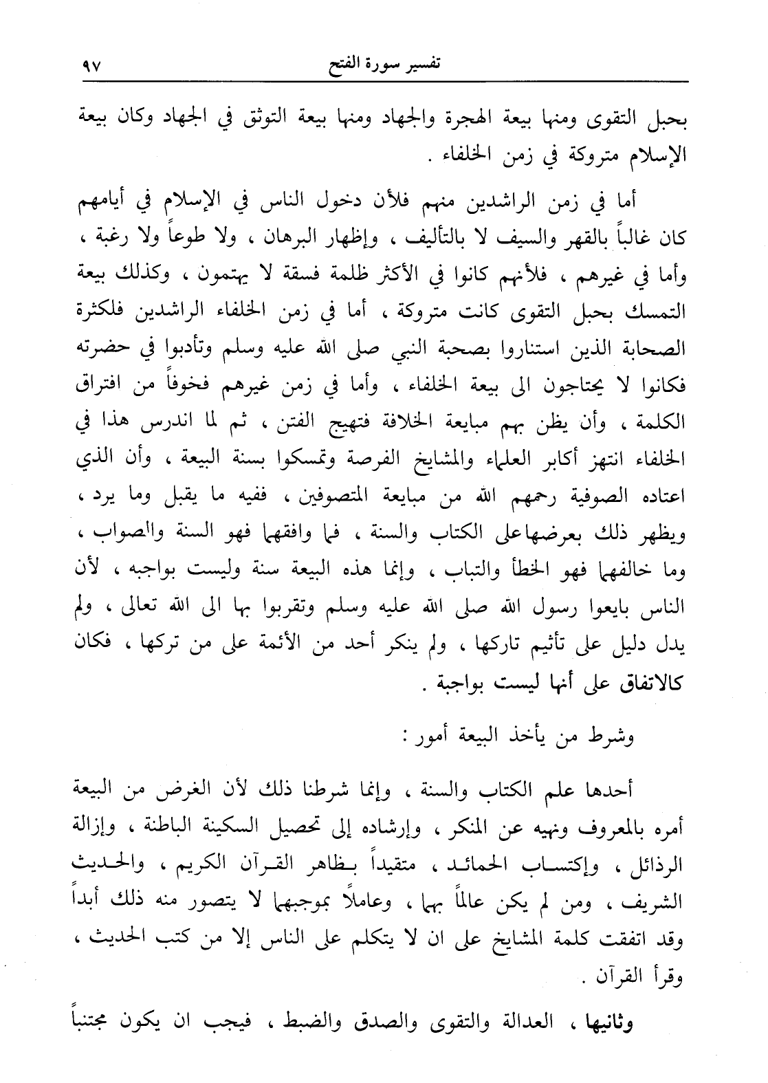 أما في زمن الراشدين منهم فلأن دخول الناس في الإسلام في أيامهم كان غالباً بالقهر والسيف لا بالتأليف، وإظهار البرهان، ولا طوعاً ولا رغبة، وأما في غيرهم، فلأنهم كانوا في الأكثر ظلمة فسقة لا يهتمون، وكذلك بيعة التمسك بحبل التقوى كانت متروكة، أما في زمن الخلفاء الراشدين فلكثرة الصحابة الذين استناروا بصحبة النبي صلى الله عليه وسلم وتأدبوا في حضرته فكانوا لا يحتاجون إلى بيعة الخلفاء، وأما في زمن غيرهم فخوفاً من افتراق الكلمة، وأن يظن بهم مبايعة الخلافة فتهيج الفتن، ثم لما اندرس هذا في الخلفاء انتهز أكابر العلماء والمشايخ الفرصة وتمسكوا بسنة البيعة، وأن الذي اعتاده الصوفية رحمهم الله من مبايعة المتصوفين، ففيه ما يقبل وما يرد، ويظهر ذلك بعرضها على الكتاب والسنة، فما وافقهما فهو السنة والصواب، وما خالفهما فهو الخطأ والتباب، وإنما هذه البيعة سنة وليست بواجبه، لأن الناس بايعوا رسول الله صلى الله عليه وسلم وتقربوا بها إلى الله تعالى، ولم يدل دليل على تأثيم تاركها، ولم ينكر أحد من الأئمة على من تركها، فكان كالاتفاق على أنها ليست بواجبة.