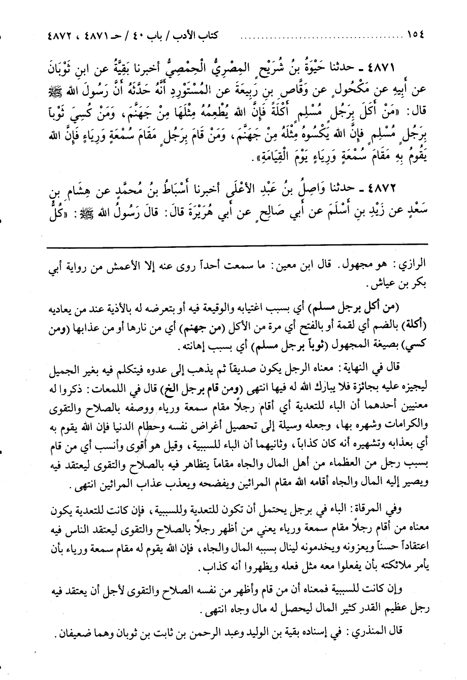 [4881] (مَنْ أَكَلَ بِرَجُلٍ مُسْلِمٍ) أَيْ بِسَبَبِ اغْتِيَابِهِ وَالْوَقِيعَةِ فِيهِ أَوْ بِتَعَرُّضِهِ لَهُ بِالْأَذِيَّةِ عِنْدَ مَنْ يُعَادِيهِ (أَكْلَةً) بِالضَّمِّ أَيْ لُقْمَةٌ أَوْ بِالْفَتْحِ أَيْ مَرَّةً مِنَ الْأَكْلِ (مِنْ جَهَنَّمَ) أَيْ مِنْ نَارِهَا أَوْ مِنْ عَذَابِهَا (وَمَنْ كُسِيَ) بِصِيغَةِ الْمَجْهُولِ (ثَوْبًا بِرَجُلٍ مُسْلِمٍ) أَيْ بِسَبَبِ إِهَانَتِهِ