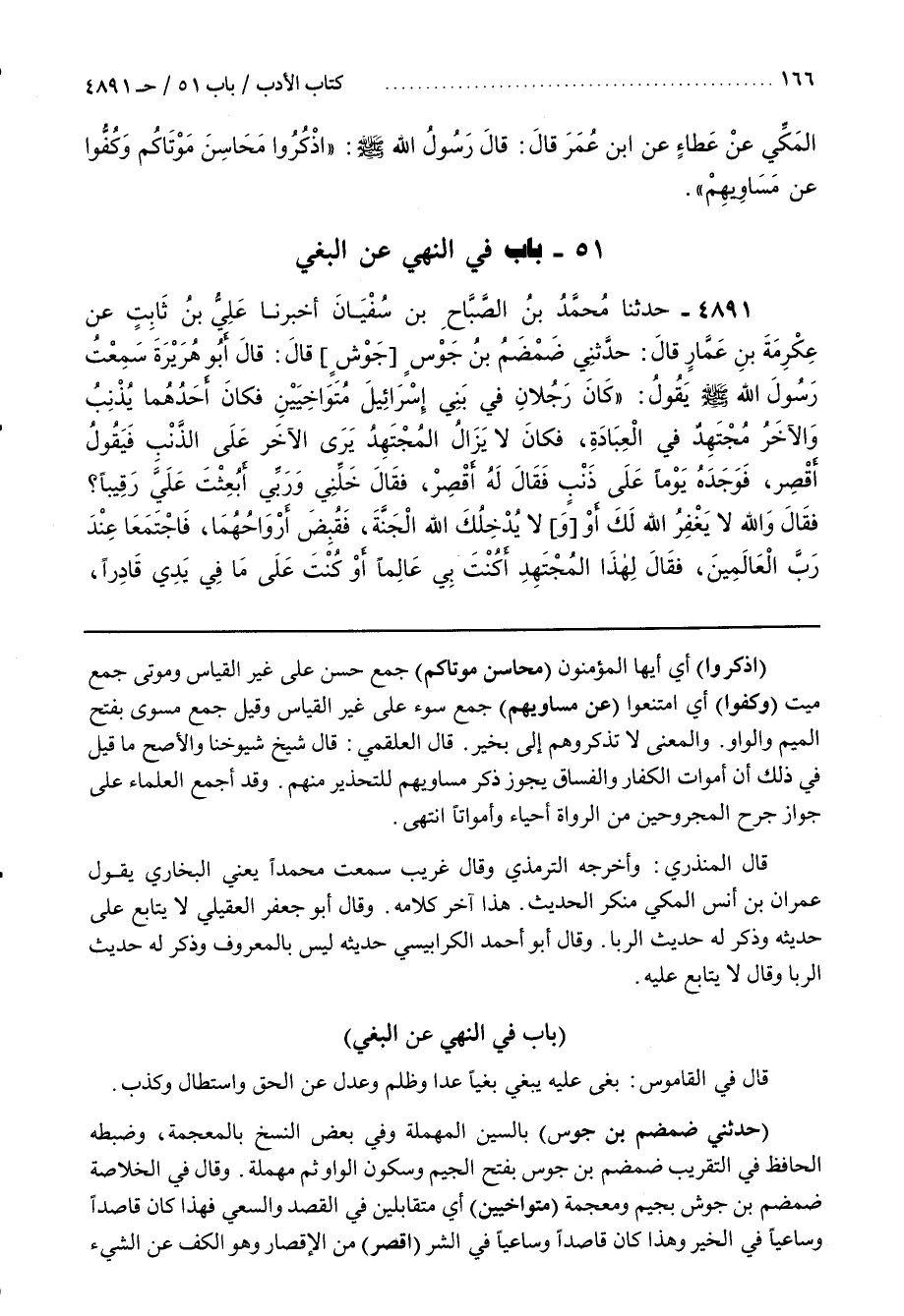 [4900] (اذْكُرُوا) أَيْ أَيُّهَا الْمُؤْمِنُونَ (مَحَاسِنَ مَوْتَاكُمْ) جَمْعُ حُسْنٍ عَلَى غَيْرِ الْقِيَاسِ وَمَوْتَى جَمْعُ مَيِّتٍ (وَكُفُّوا) أَيِ امْتَنِعُوا (عَنْ مَسَاوِيهِمْ) جَمْعُ سُوءٍ عَلَى غَيْرِ الْقِيَاسِ وَقِيلَ جَمْعُ مَسْوًى بِفَتْحِ الْمِيمِ وَالْوَاوِ