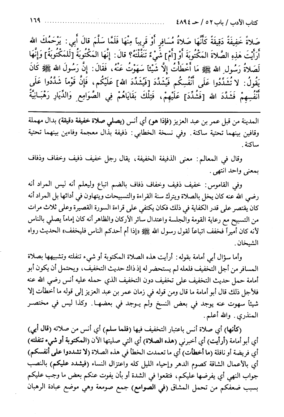 وَأَمَّا سُؤَالُ أَبِي أُمَامَةَ بِقَوْلِهِ أَرَأَيْتَ هَذِهِ الصَّلَاةَ الْمَكْتُوبَةَ أَوْ شَيْءٌ تَنَفَّلْتَهُ وَتَشْبِيهُهَا بِصَلَاةِ الْمُسَافِرِ مِنْ أَجْلِ التَّخْفِيفِ فَلَعَلَّهُ لَمْ يَسْتَحْضِرْ لَهُ إِذْ ذَاكَ حَدِيثَ التَّخْفِيفِ وَيَحْتَمِلُ أَنْ يَكُونَ أَبُو أُمَامَةَ حَمَلَ حَدِيثَ التَّخْفِيفِ عَلَى تَخْفِيفٍ دُونَ التَّخْفِيفِ الَّذِي حَمَلَهُ عَلَيْهِ أَنَسٌ رَضِيَ اللَّهُ عَنْهُ فَلِأَجْلِ ذَلِكَ قَالَ أَبُو أُمَامَةَ مَا قَالَ وَمِنْ قَوْلِهِ فِي زَمَانِ عُمَرَ بْنِ عَبْدِ الْعَزِيزِ إِلَى قَوْلِهِ مَا أَخْطَأْتُ إِلَّا شَيْئًا سَهَوْتُ عَنْهُ يُوجَدُ فِي بَعْضِ النُّسَخِ وَلَمْ يُوجَدْ فِي بَعْضِهَا