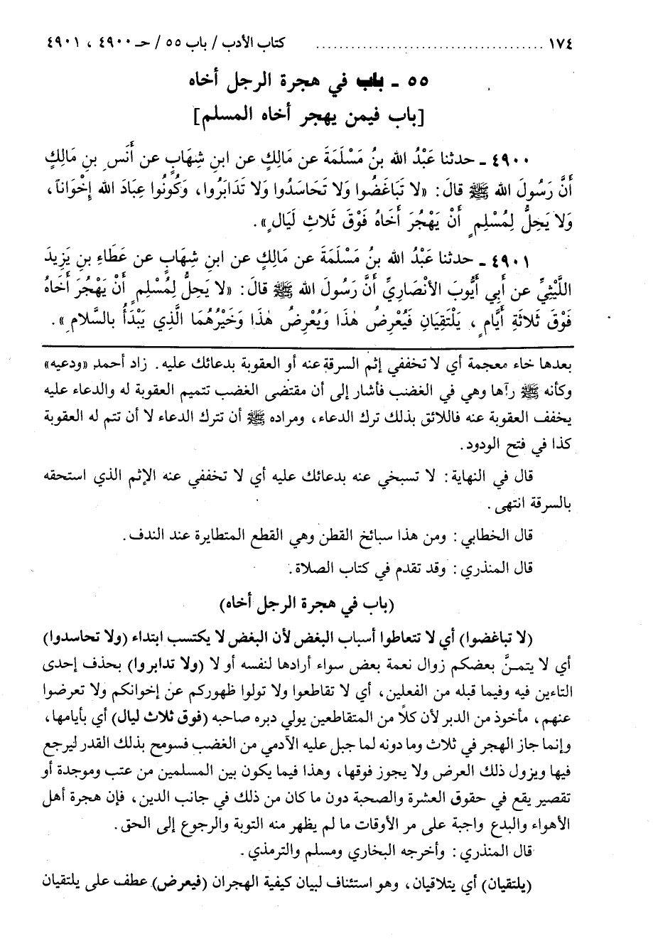 (لَا تَبَاغَضُوا) أَيْ لَا تَتَعَاطَوْا أَسْبَابَ الْبُغْضِ لِأَنَّ الْبُغْضَ لَا يُكْتَسَبُ ابْتِدَاءً (وَلَا تَحَاسَدُوا) أَيْ لَا يَتَمَنَّى بَعْضُكُمْ زَوَالَ نِعْمَةِ بَعْضٍ سَوَاءٌ أَرَادَهَا لِنَفْسِهِ أَوْ لَا (وَلَا تَدَابَرُوا) بِحَذْفِ إِحْدَى التَّائَيْنِ فِيهِ وَفِيمَا قَبْلَهُ مِنَ الْفِعْلَيْنِ أَيْ لَا تَقَاطَعُوا وَلَا تُوَلُّوا ظُهُورَكُمْ عَنْ إِخْوَانِكُمْ وَلَا تُعْرِضُوا عَنْهُمْ مَأْخُوذٌ مِنَ الدُّبُرِ لِأَنَّ كُلًّا مِنَ الْمُتَقَاطِعَيْنِ يُوَلِّي دُبُرَهُ صَاحِبَهُ (فَوْقَ ثَلَاثِ لَيَالٍ) أَيْ بِأَيَّامِهَا وَإِنَّمَا جَازَ الْهَجْرُ فِي ثَلَاثٍ وَمَا دُونَهُ لِمَا جُبِلَ عَلَيْهِ الْآدَمِيُّ مِنَ الْغَضَبِ فَسُومِحَ بِذَلِكَ الْقَدْرِ لِيَرْجِعَ فِيهَا وَيَزُولَ ذَلِكَ الْعَرَضُ وَلَا يَجُوزُ فَوْقَهَا وَهَذَا فِيمَا يَكُونُ بَيْنَ الْمُسْلِمِينَ مِنْ عَتَبٍ وَمَوْجِدَةٍ أَوْ تَقْصِيرٍ يَقَعُ فِي حُقُوقِ الْعِشْرَةِ وَالصُّحْبَةِ دُونَ مَا كَانَ مِنْ ذَلِكَ فِي جَانِبِ الدِّينِ فَإِنَّ هِجْرَةَ أَهْلِ الْأَهْوَاءِ وَالْبِدَعِ وَاجِبَةٌ عَلَى مَرِّ الْأَوْقَاتِ مَا لَمْ يَظْهَرْ مِنْهُ التَّوْبَةُ وَالرُّجُوعُ إِلَى الْحَقِّ
