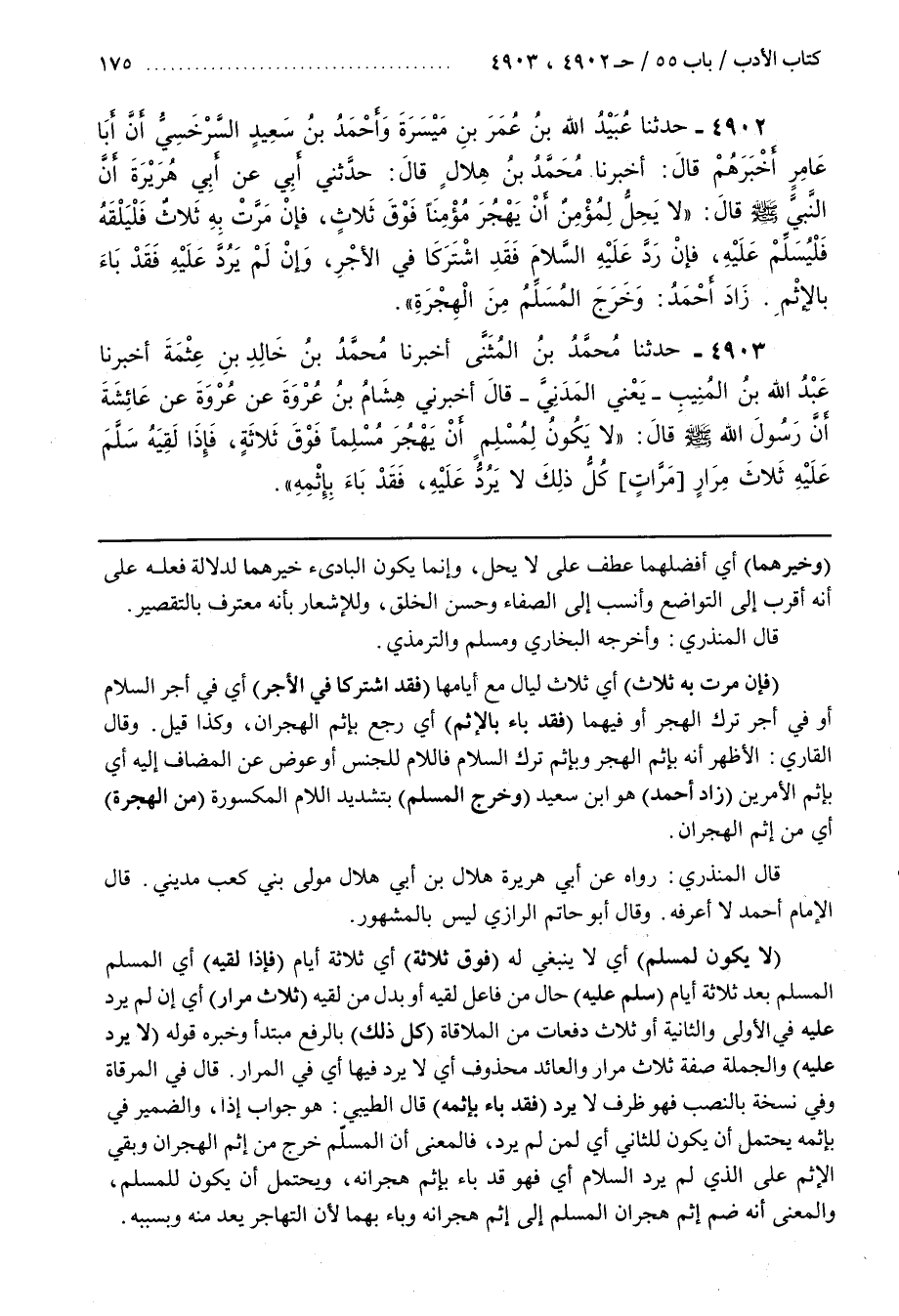 [4913] (لَا يَكُونُ لِمُسْلِمٍ أَيْ لَا يَنْبَغِي لَهُ فَوْقَ ثَلَاثَةٍ) أَيْ ثَلَاثَةِ أَيَّامٍ (فَإِذَا لَقِيَهُ) أَيِ الْمُسْلِمُ الْمُسْلِمَ بَعْدَ ثَلَاثَةِ أَيَّامٍ (سَلَّمَ عَلَيْهِ) حَالٌ مِنْ فَاعِلِ لَقِيَهُ أَوْ بَدَلٌ مَنْ لَقِيَهُ (ثَلَاثَ مِرَارٍ) أَيْ إِنْ لَمْ يَرُدَّ عَلَيْهِ فِي الْأُولَى وَالثَّانِيَةِ أَوْ ثَلَاثِ دَفَعَاتٍ مِنَ الْمُلَاقَاةِ (كُلُّ ذَلِكَ) بِالرَّفْعِ مُبْتَدَأٌ وَخَبَرُهُ قَوْلُهُ (لَا يَرُدُّ عَلَيْهِ) وَالْجُمْلَةُ صِفَةُ ثَلَاثِ مِرَارٍ وَالْعَائِدُ مَحْذُوفٌ أَيْ لَا يَرُدُّ فِيهَا أَيْ فِي الْمِرَارِ