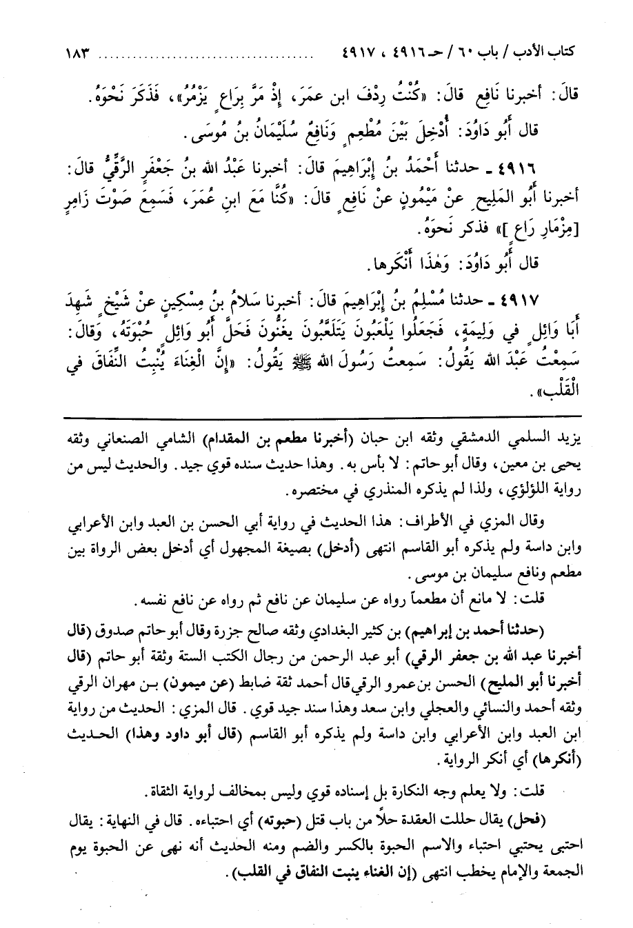 قَالَ فِي النِّهَايَةِ يُقَالُ احْتَبَى يَحْتَبِي احْتِبَاءً وَالِاسْمُ الْحِبْوَةُ بِالْكَسْرِ وَالضَّمِّ وَمِنْهُ الْحَدِيثُ أَنَّهُ نَهَى عَنِ الْحِبْوَةِ يَوْمِ الْجُمُعَةِ وَالْإِمَامُ يَخْطُبُ انْتَهَى (إِنَّ الْغِنَاءَ ينبت النفاق في القلب