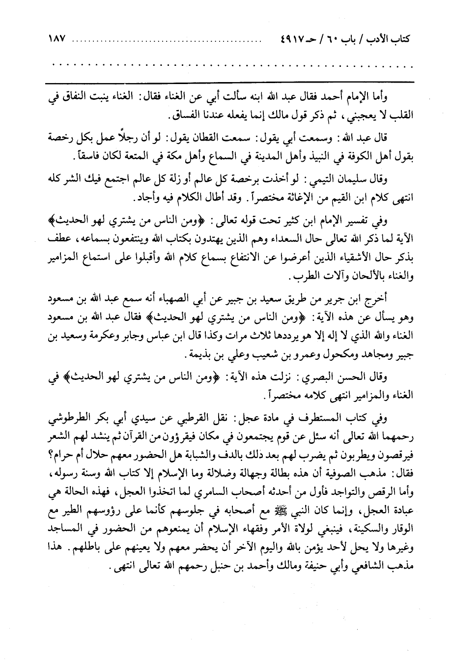 وفي تفسير الإمام بن كَثِيرٍ تَحْتَ قَوْلِهِ تَعَالَى وَمِنَ النَّاسِ مَنْ يشتري لهو الحديث الْآيَةَ لَمَّا ذَكَرَ اللَّهُ تَعَالَى حَالَ السُّعَدَاءِ وَهُمُ الَّذِينَ يَهْتَدُونَ بِكِتَابِ اللَّهِ وَيَنْتَفِعُونَ بِسَمَاعِهِ عَطَفَ بِذِكْرِ حَالِ الْأَشْقِيَاءِ الَّذِينَ أَعْرَضُوا عَنْ الِانْتِفَاعِ بِسَمَاعِ كَلَامِ اللَّهِ وَأَقْبَلُوا عَلَى اسْتِمَاعِ المزامير والغناء بالألحان وآلات الطرب