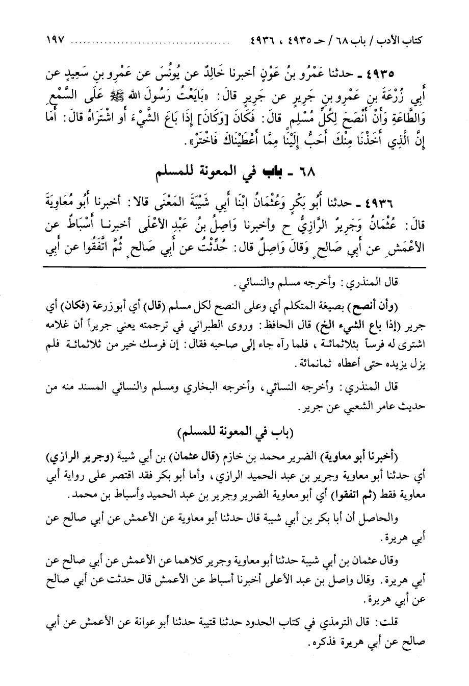 قَالَ الْمُنْذِرِيُّ وَأَخْرَجَهُ النَّسَائِيُّ وَأَخْرَجَهُ الْبُخَارِيُّ وَمُسْلِمٌ وَالنَّسَائِيُّ الْمُسْنَدُ مِنْهُ مِنْ حَدِيثِ عَامِرٍ الشَّعْبِيِّ عن جرير