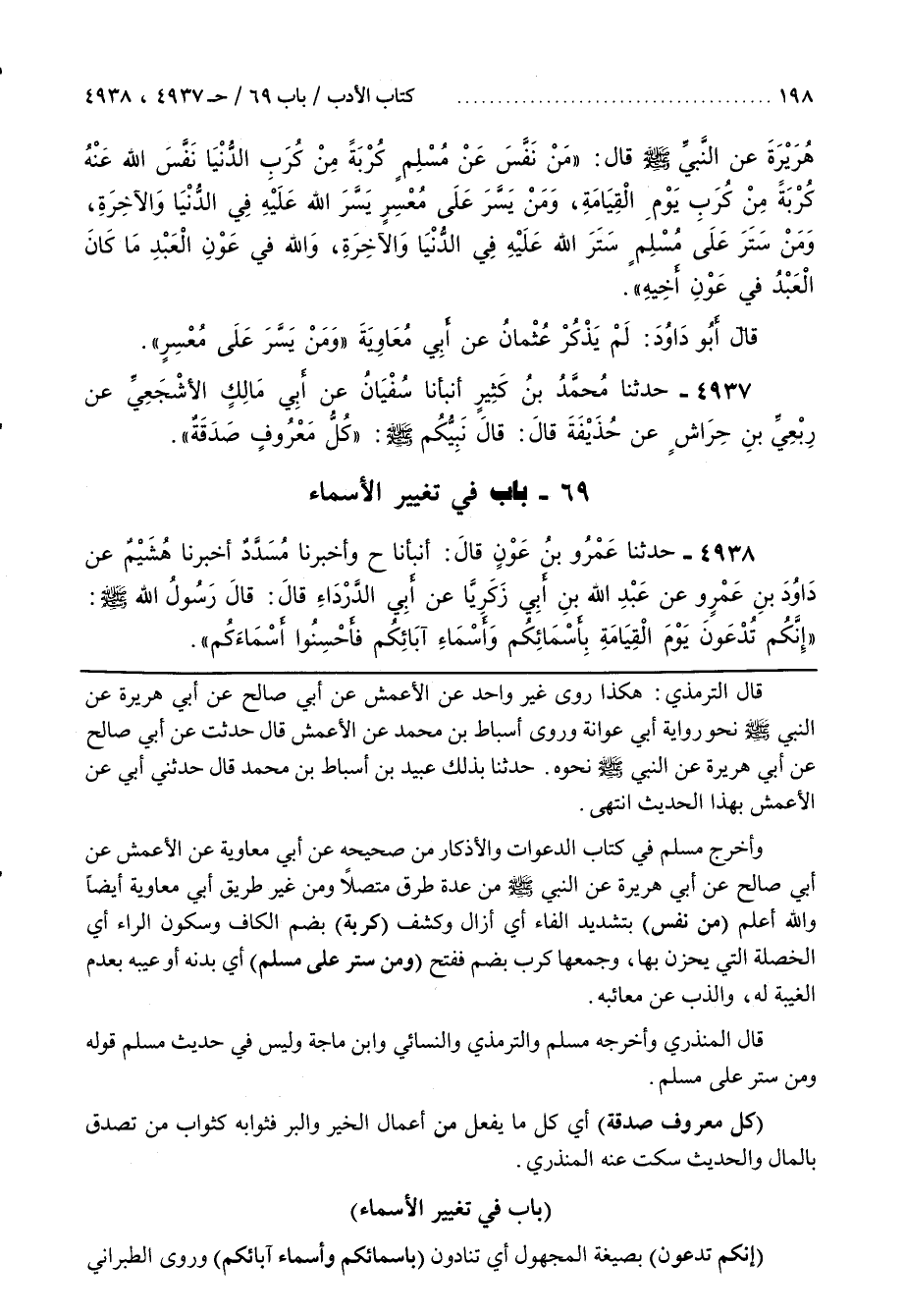 وَأَخْرَجَ مُسْلِمٌ فِي كِتَابِ الدَّعَوَاتِ وَالْأَذْكَارِ مِنْ صَحِيحِهِ عَنْ أَبِي مُعَاوِيَةَ عَنِ الْأَعْمَشُ عَنْ أَبِي صَالِحٍ عَنْ أَبِي هُرَيْرَةَ عَنِ النَّبِيِّ صَلَّى اللَّهُ عَلَيْهِ وَسَلَّمَ مِنْ عِدَّةِ طُرُقٍ مُتَّصِلًا وَمِنْ غَيْرِ طَرِيقِ أَبِي مُعَاوِيَةَ أَيْضًا وَاللَّهُ أَعْلَمُ (مَنْ نَفَّسَ) بِتَشْدِيدِ الْفَاءِ أَيْ أَزَالَ وَكَشَفَ (كُرْبَةً) بِضَمِّ الْكَافِ وَسُكُونِ الرَّاءِ أَيِ الْخَصْلَةَ الَّتِي يَحْزَنُ بِهَا وَجَمْعُهَا كُرَبٌ بِضَمٍّ فَفَتْحٍ (وَمَنْ سَتَرَ عَلَى مُسْلِمٍ) أَيْ بَدَنَهُ أَوْ عَيْبَةً بِعَدَمِ الْغِيبَةِ لَهُ وَالذَّبِّ عَنْ مَعَائِبِهِ