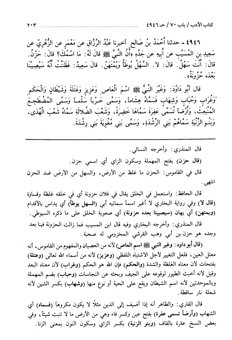 قَالَ الْحَافِظُ وَاسْتُعْمِلَ فِي الْخَلْقِ يُقَالُ فِي فُلَانٍ حُزُونَةٌ أَيْ فِي خَلْقِهِ غِلْظَةٌ وَقَسَاوَةٌ (قَالَ لَا) وَفِي رِوَايَةِ الْبُخَارِيِّ لَا أُغَيِّرُ اسْمًا سَمَّانِيهِ أَبِي (السَّهْلُ يُوطَأُ) أَيْ يُدَاسُ بِالْأَقْدَامِ (وَيُمْتَهَنُ) أَيْ يُهَانُ (سَيُصِيبُنَا بَعْدَهُ حُزُونَةٌ) أَيْ صُعُوبَةُ الْخَلْقِ عَلَى مَا ذَكَرَهُ السُّيُوطِيُّ