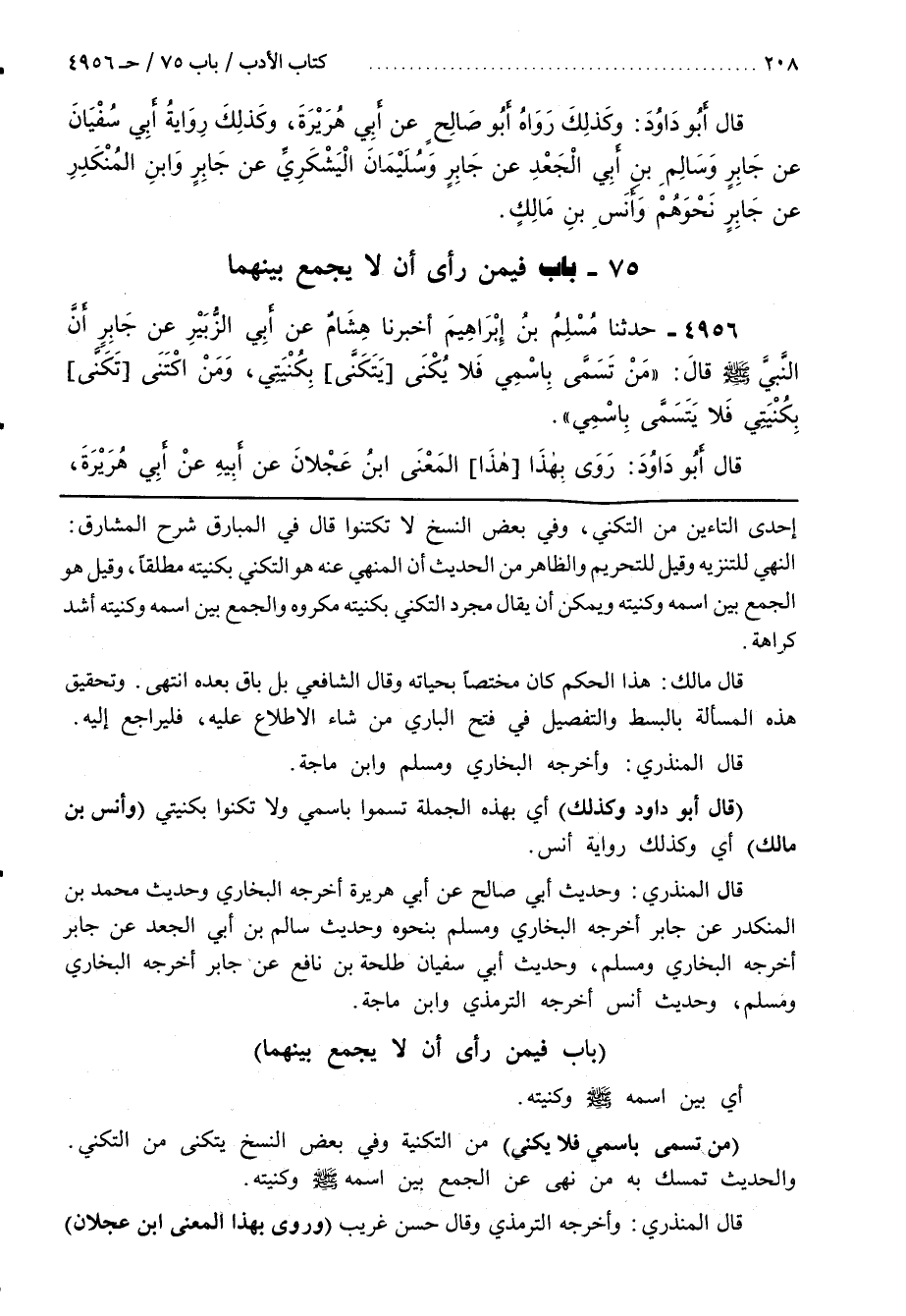 وَالْحَدِيثُ تَمَسَّكَ بِهِ مَنْ نَهَى عَنِ الجمع بين اسمه صلى الله عليه وسلم وَكُنْيَتِهِ