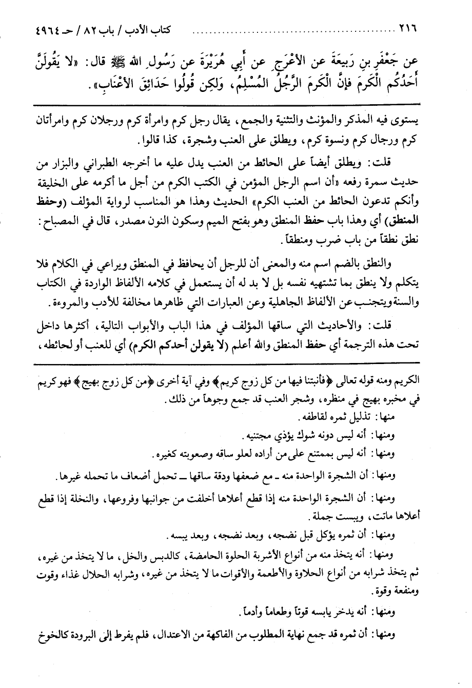 قُلْتُ وَيُطْلَقُ أَيْضًا عَلَى الْحَائِطِ مِنَ الْعِنَبِ يَدُلُّ عَلَيْهِ مَا أَخْرَجَهُ الطَّبَرَانِيُّ وَالْبَزَّارُ مِنْ حَدِيثِ سَمُرَةَ رَفْعُهُ أَنَّ اسْمَ الرَّجُلِ الْمُؤْمِنِ فِي الْكُتُبِ الْكَرْمُ مِنْ أَجْلِ مَا أَكْرَمَهُ اللَّهُ عَلَى الْخَلِيفَةِ وَأَنَّكُمْ تَدْعُونَ الْحَائِطَ مِنَ الْعِنَبِ الْكَرْمَ الْحَدِيثَ وَهَذَا هُوَ الْمُنَاسِبُ لِرِوَايَةِ الْمُؤَلِّفِ (وَحِفْظِ الْمَنْطِقِ) أَيْ وَهَذَا بَابُ حِفْظِ الْمَنْطِقِ وَهُوَ بِفَتْحِ الْمِيمِ وَسُكُونِ النُّونِ مَصْدَرٌ قَالَ فِي الْمِصْبَاحِ نَطَقَ نُطْقًا مِنْ بَابِ ضَرَبَ وَمَنْطِقًا
