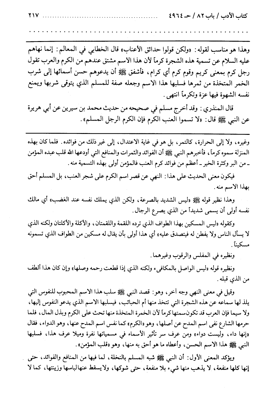 قَالَ الْمُنْذِرِيُّ وَقَدْ أَخْرَجَ مُسْلِمٌ فِي صَحِيحِهِ مِنْ حَدِيثِ مُحَمَّدِ بْنِ سِيرِينَ عَنْ أَبِي هُرَيْرَةَ عَنِ النَّبِيِّ صَلَّى اللَّهُ عَلَيْهِ وَسَلَّمَ قَالَ لَا تُسَمُّوا الْعِنَبَ الْكَرْمَ فَإِنَّ الْكَرْمَ الرَّجُلُ المسلم