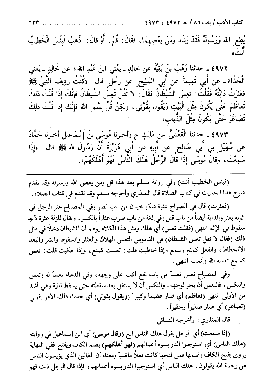 [4982] (فَعَثَرَتْ) قَالَ فِي الصُّرَاحِ عَثْرَةً شكو خيدن مِنْ بَابِ نَصَرَ وَفِي الْمِصْبَاحِ عَثَرَ الرَّجُلُ فِي ثَوْبِهِ يَعْثِرُ وَالدَّابَّةُ أَيْضًا مِنْ بَابِ قَتَلَ وَفِي لُغَةٍ مِنْ بَابِ ضَرَبَ عِثَارًا بِالْكَسْرِ وَيُقَالُ لِلزَّلَّةِ عَثْرَةٌ لِأَنَّهَا سُقُوطٌ فِي الْإِثْمِ انْتَهَى (فَقُلْتُ تَعِسَ) أَيْ هَلَكَ وَمِثْلُ هَذَا الْكَلَامِ يُوهِمُ أَنَّ لِلشَّيْطَانِ دَخْلًا فِي مِثْلِ ذَلِكَ (فَقَالَ لَا تَقُلْ تَعِسَ الشَّيْطَانُ) فِي الْقَامُوسِ التَّعِسُ الْهَلَاكُ وَالْعِثَارُ وَالسُّقُوطُ وَالشَّرُّ وَالْبُعْدُ الِانْحِطَاطُ وَالْفِعْلُ كَمَنَعَ وَسَمِعَ وَإِذَا خَاطَبْتَ قُلْتَ تَعِسْتَ كَمَنَعَ وَإِذَا حَكَيْتَ قُلْتَ تَعِسَ كَسَمِعَ تَعَسَهُ اللَّهُ وَأَتْعَسَهُ انْتَهَى