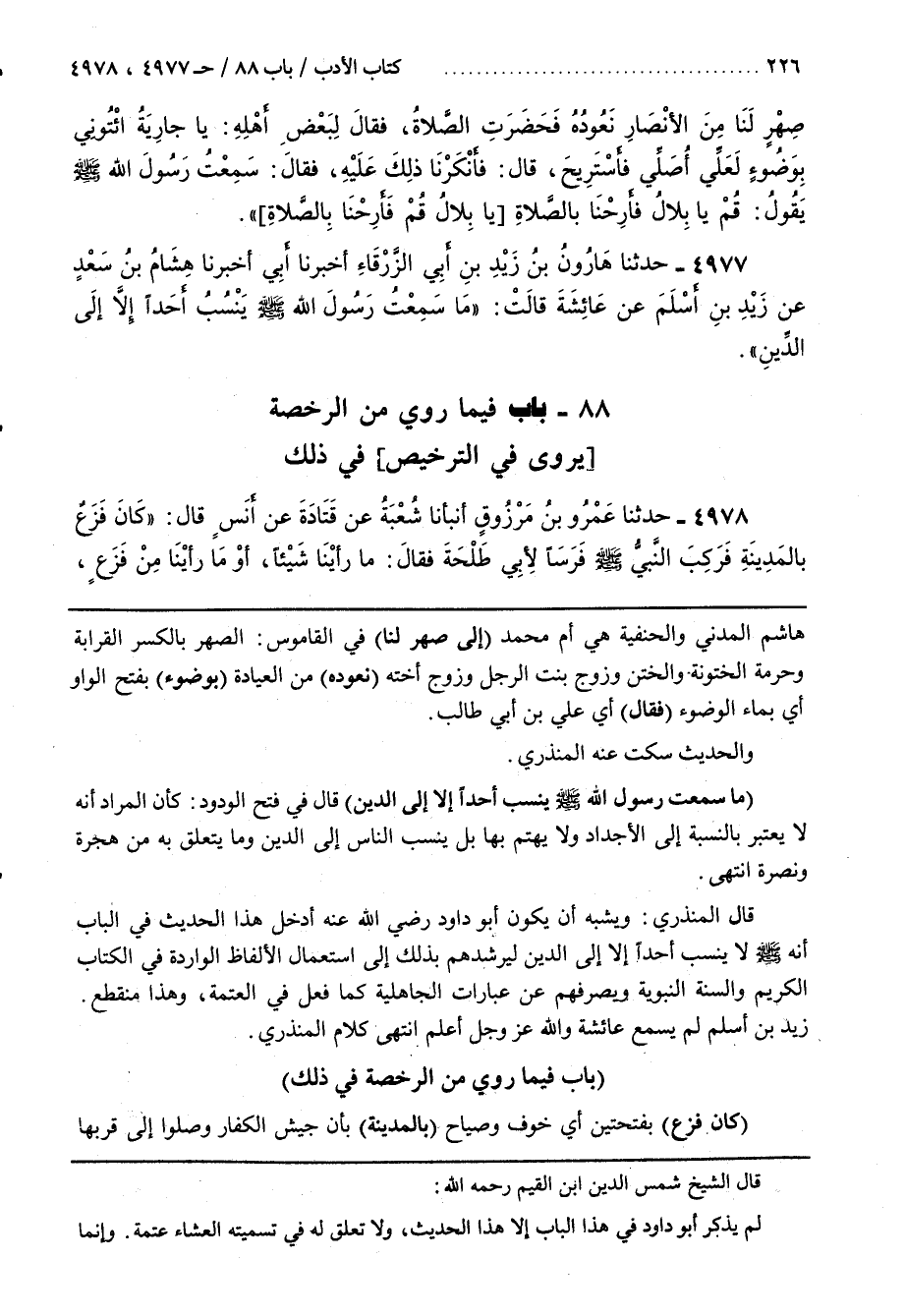 قَالَ الْمُنْذِرِيُّ وَيُشْبِهُ أَنْ يَكُونَ أَبُو دَاوُدَ رَضِيَ اللَّهُ عَنْهُ أَدْخَلَ هَذَا الْحَدِيثَ فِي الْبَابِ أَنَّهُ صَلَّى اللَّهُ عَلَيْهِ وَسَلَّمَ لَا يَنْسُبُ أَحَدًا إِلَّا إِلَى الدِّينِ لِيُرْشِدَهُمْ بِذَلِكَ إِلَى اسْتِعْمَالِ الْأَلْفَاظِ الْوَارِدَةِ فِي الْكِتَابِ الْكَرِيمِ وَالسُّنَّةِ النَّبَوِيَّةِ وَيَصْرِفَهُمْ عَنْ عِبَارَاتِ الْجَاهِلِيَّةِ كَمَا فَعَلَ فِي الْعَتَمَةِ وَهَذَا مُنْقَطِعٌ