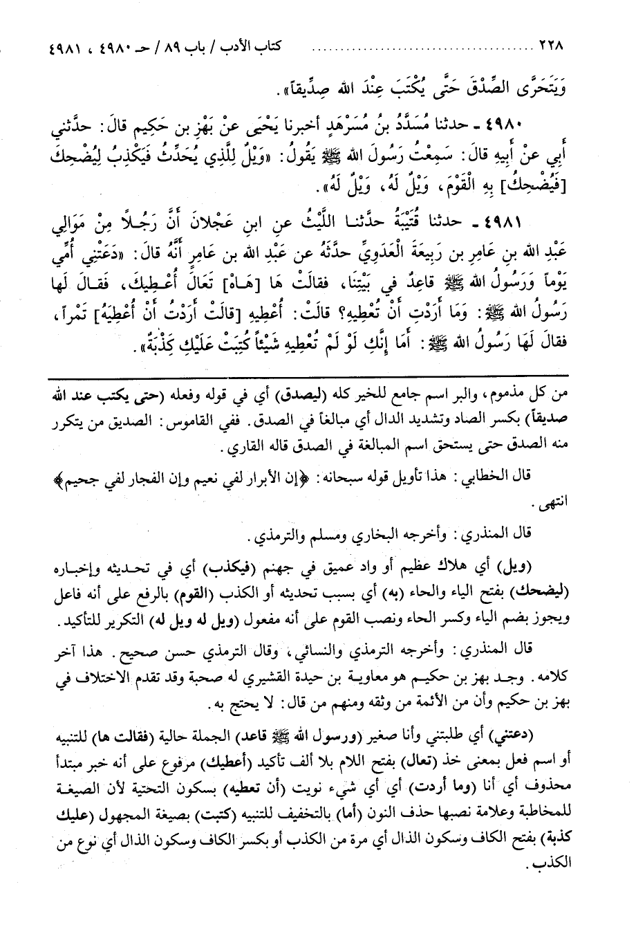 [4990] (وَيْلٌ) أَيْ هَلَاكٌ عَظِيمٌ أَوْ وَادٍ عَمِيقٍ فِي جَهَنَّمَ (فَيَكْذِبُ) أَيْ فِي تَحْدِيثِهِ وَإِخْبَارِهِ (لِيُضْحِكَ) بِفَتْحِ الْيَاءِ وَالْحَاءِ (بِهِ) أَيْ بِسَبَبِ تَحْدِيثِهِ أَوِ الْكَذِبِ (الْقَوْمُ) بِالرَّفْعِ عَلَى أَنَّهُ فَاعِلٌ وَيَجُوزُ بِضَمِّ الْيَاءِ وَكَسْرِ الْحَاءِ وَنَصْبِ الْقَوْمِ عَلَى أَنَّهُ مَفْعُولٌ (وَيْلٌ لَهُ وَيْلٌ لَهُ) التَّكْرِيرُ لِلتَّأْكِيدِ
