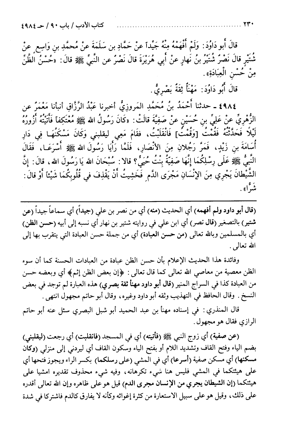 [4994] (عَنْ صَفِيَّةَ) أَيْ زَوْجِ النَّبِيِّ صَلَّى اللَّهُ عَلَيْهِ وَسَلَّمَ (فَأَتَيْتُهُ) أَيْ فِي الْمَسْجِدِ (فَانْقَلَبَتُ) أَيْ رَجَعَتُ (لِيُقَلِّبَنِي) بِضَمِّ الْيَاءِ وَفَتْحِ الْقَافِ وَتَشْدِيدِ اللَّامِ أَوْ بِفَتْحِ الْيَاءِ وَسُكُونِ الْقَافِ أَيْ لِيَرُدَّنِي إِلَى مَنْزِلِي (وَكَانَ مَسْكَنُهَا) أَيْ مَسْكَنُ صَفِيَّةَ (أَسْرَعَا) أَيْ فِي الْمَشْيِ (عَلَى رِسْلِكُمَا) بِكَسْرِ الرَّاءِ وَيَجُوزُ فَتْحُهَا أَيْ عَلَى هَيْئَتِكُمَا فِي الْمَشْيِ فَلَيْسَ هُنَا شَيْءٌ تَكْرَهَانِهِ وَفِيهِ شَيْءٌ مَحْذُوفٌ تَقْدِيرُهُ امْشِيَا عَلَى هَيْئَتِكُمَا (إِنَّ الشَّيْطَانَ يَجْرِي مِنَ الْإِنْسَانِ مَجْرَى الدَّمِ) قِيلَ هُوَ عَلَى ظَاهِرِهِ وَإِنَّ اللَّهَ تَعَالَى أَقْدَرَهُ عَلَى ذَلِكَ وَقِيلَ هُوَ عَلَى سَبِيلِ الِاسْتِعَارَةِ مِنْ كَثْرَةِ إِغْوَائِهِ وَكَأَنَّهُ لَا يُفَارِقُ كَالدَّمِ فَاشْتَرَكَا في شدة