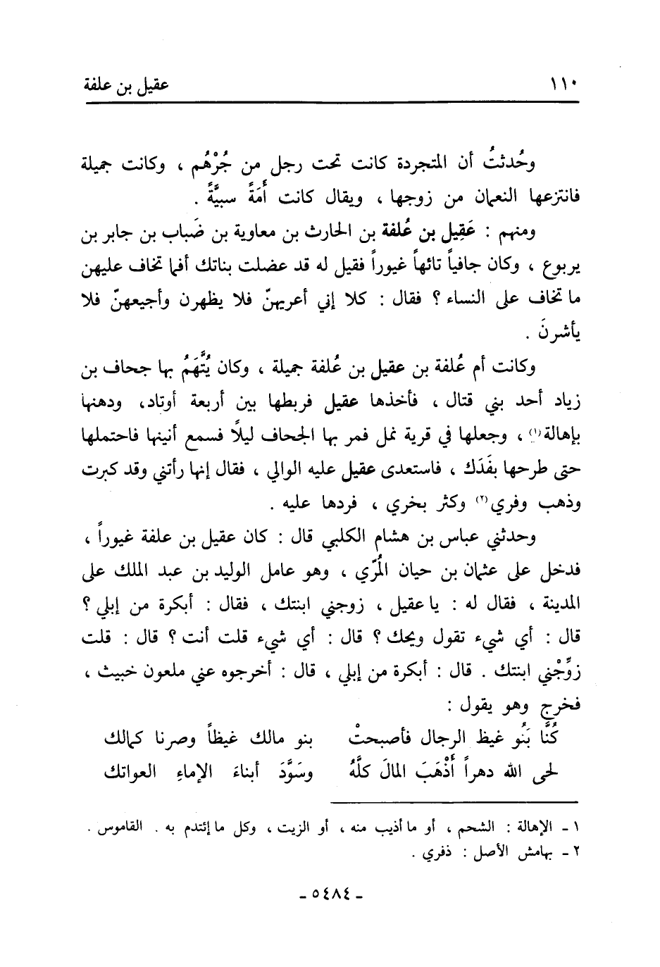 وحدَّثني عَبَّاس بْن هشام الكلبي قَالَ: كَانَ عقيل بْن علفة غيورًا، فدخل عَلَى عثمان بْن حيان المُرّي، وهو عامل الوليد بْن عَبْد الملك عَلَى المدينة، فَقَالَ لَهُ: يا عقيل، زوجني ابنتك، فَقَالَ: أبكرة من إبلي؟
