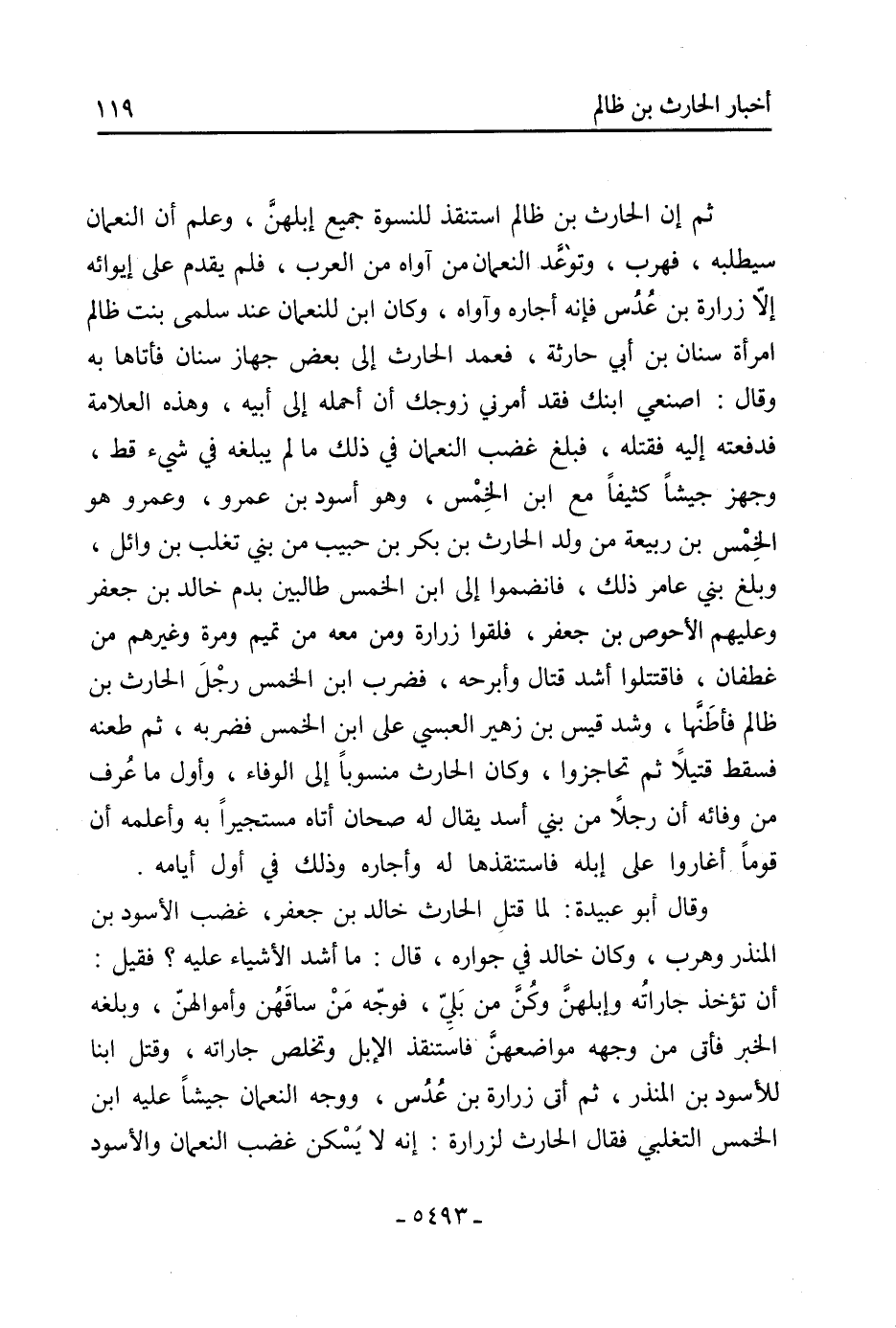 أن تؤخذ جاراتهُ وإبلهنَّ وكُنَّ من بَليّ، فوجّه مَنْ ساقَهُن وأموالهنّ، وبلغه الخبر فأتى من وجهه مواضعهنَّ فاستنقذ الإبل وتخلص جاراته، وقتل ابنا للأسود بْن المنذر، ثُمَّ أتى زرارة بْن عُدُس، ووجه النعمان جيشًا عَلَيْهِ ابْنُ الخمس التغلبي فَقَالَ الحارث لزرارة: إنه لا يَسْكن غضب النعمان والأسود