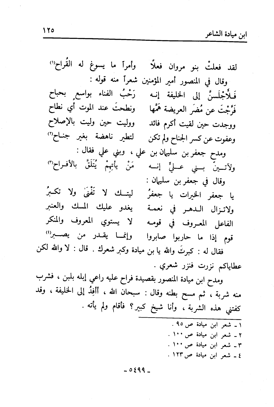 ومدح ابْنُ ميادة المنصور بقصيدة فراح عَلَيْهِ راعي إبله بلبن، فشرب مِنْهُ شربة، ثُمَّ مسح بطنه وقَالَ: سبحان اللَّه، أأفِدُ إلى الخليفة، وَقَدْ كفتني هَذِهِ الشربة، وأنا شيخ كبير؟ فأقام ولم يأته.