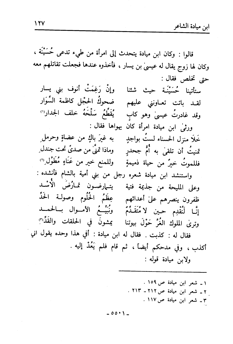 قَالُوا: وكان ابْنُ ميادة يتحدث إلى امْرَأَة من طيّئ تدعى حُسَيْنَة، وكان لها زوج يُقال لَهُ عِيسَى بْن يسار، فأخذوه عندها فجعلت تقاتلهم معه حتى تخلص فَقَالَ: