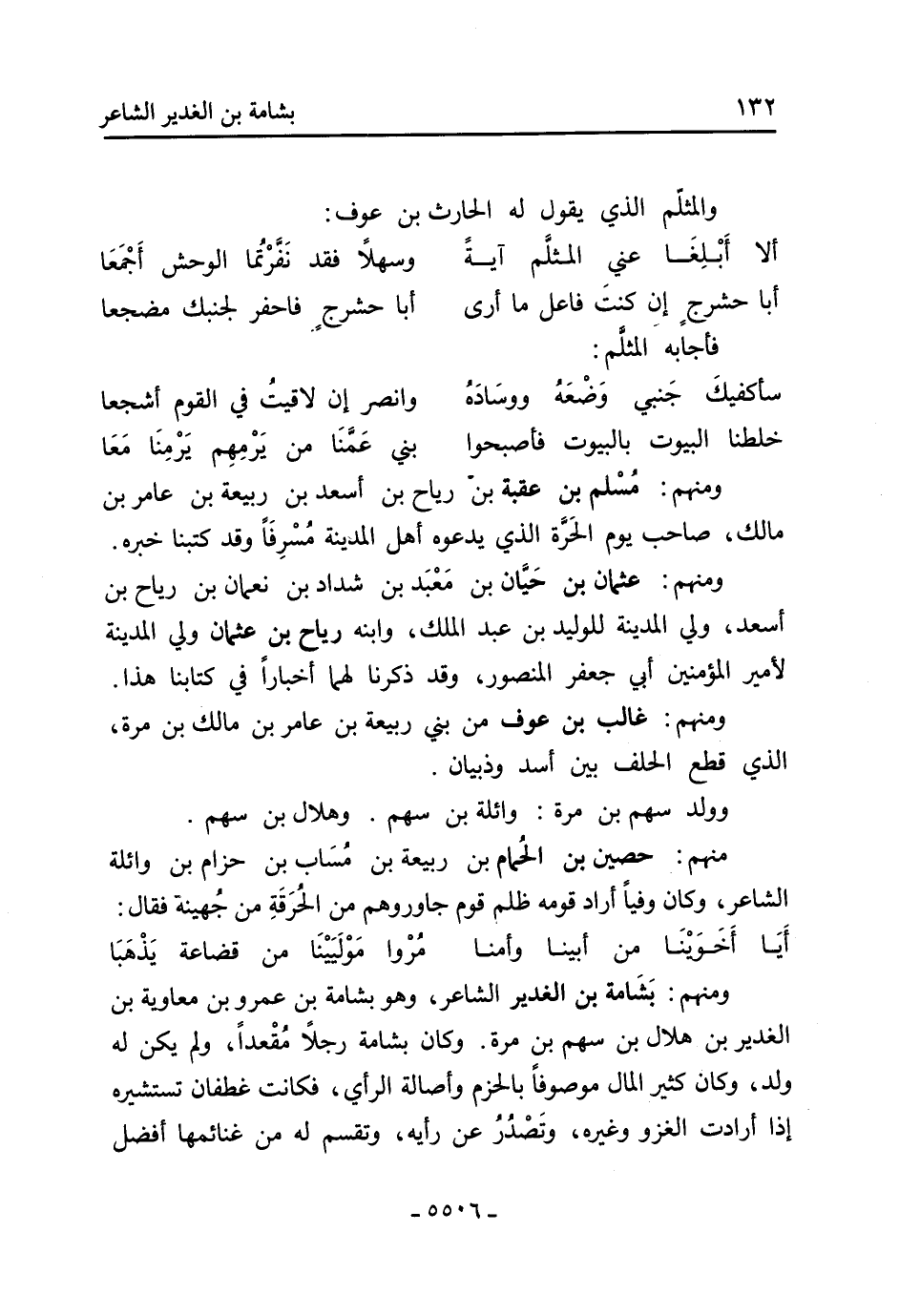 ومنهم: بَشَامة بْن الغدير الشَّاعِر، وهو بشامة بْن عَمْرو بْن معاوية بْن الغدير بْن هلال بْن سهم بْن مرة.