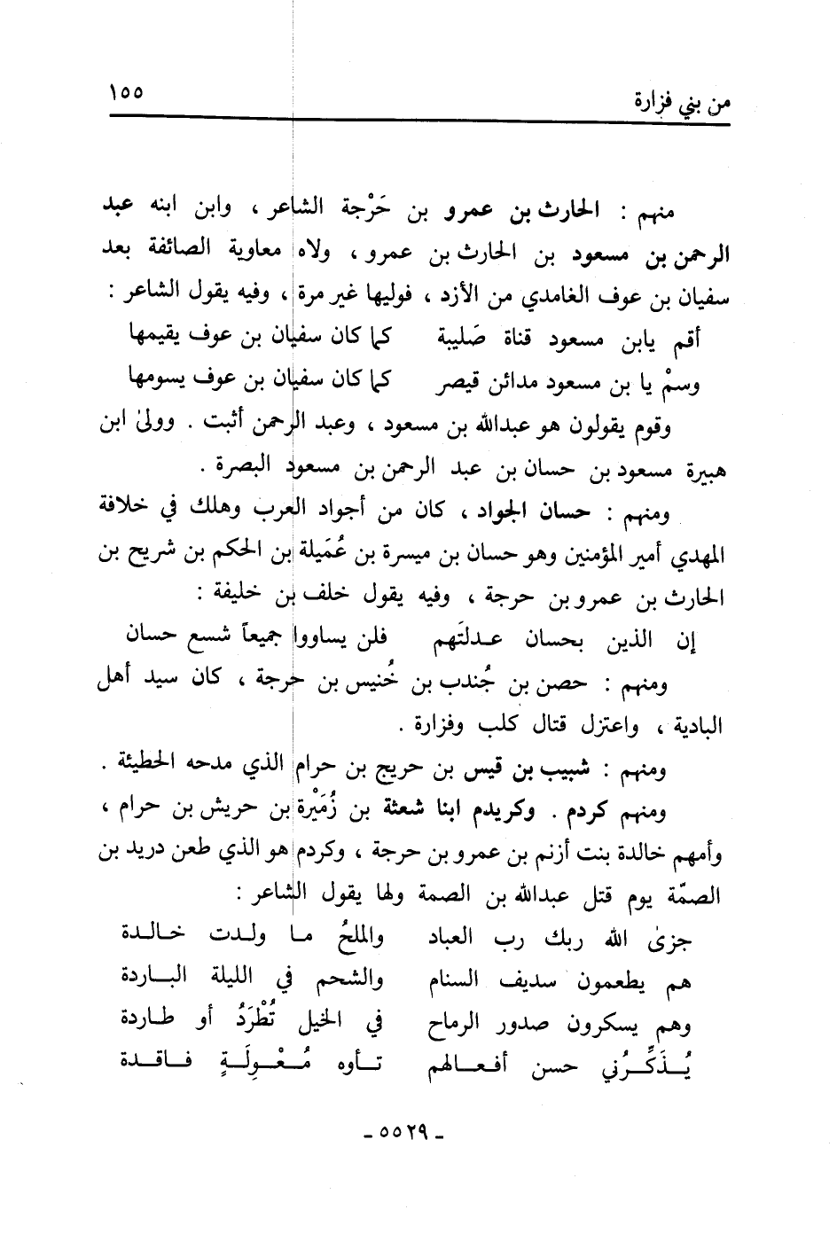 ومنهم: حسان الجواد، كَانَ من أجواد العرب وهلك فِي خلافة المهدي أمير المؤمنين وهو حسان بْن ميسرة بْن عُمَيلة بْن الحكم بْن شريح بْن الحارث بْن عمرو بن حرجة، وفيه يَقُولُ خلف بْن خليفة: