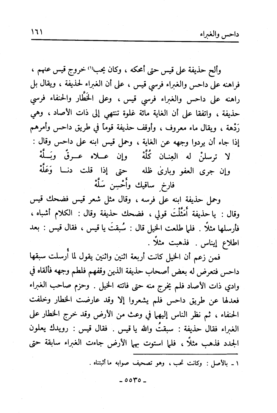 وألح حذيفة عَلَى قيس حتَّى أمحكه، وكان يجب [1] خروج قيس عَنْهُمْ، فراهنه عَلَى داحس والغبراء فرسي قيس، عَلَى أن الغبراء لحذيفة، وَيُقَال بل راهنه عَلَى داحس والغبراء فرسي قيس، وعلى الخَطَّار والحنفاء فرسي حذيفة، واتفقا عَلَى أن الغاية مائة غلوة تنتهي إلى ذات الأصاد، وهي رَدْهة، وَيُقَال ماء معروف، وأوقف حذيفة قومًا فِي طريق داحس وأمرهم إِذَا جاء أن يردوا وجهه عن الغاية، وحمل قيس ابنه عَلَى داحس وقَالَ: