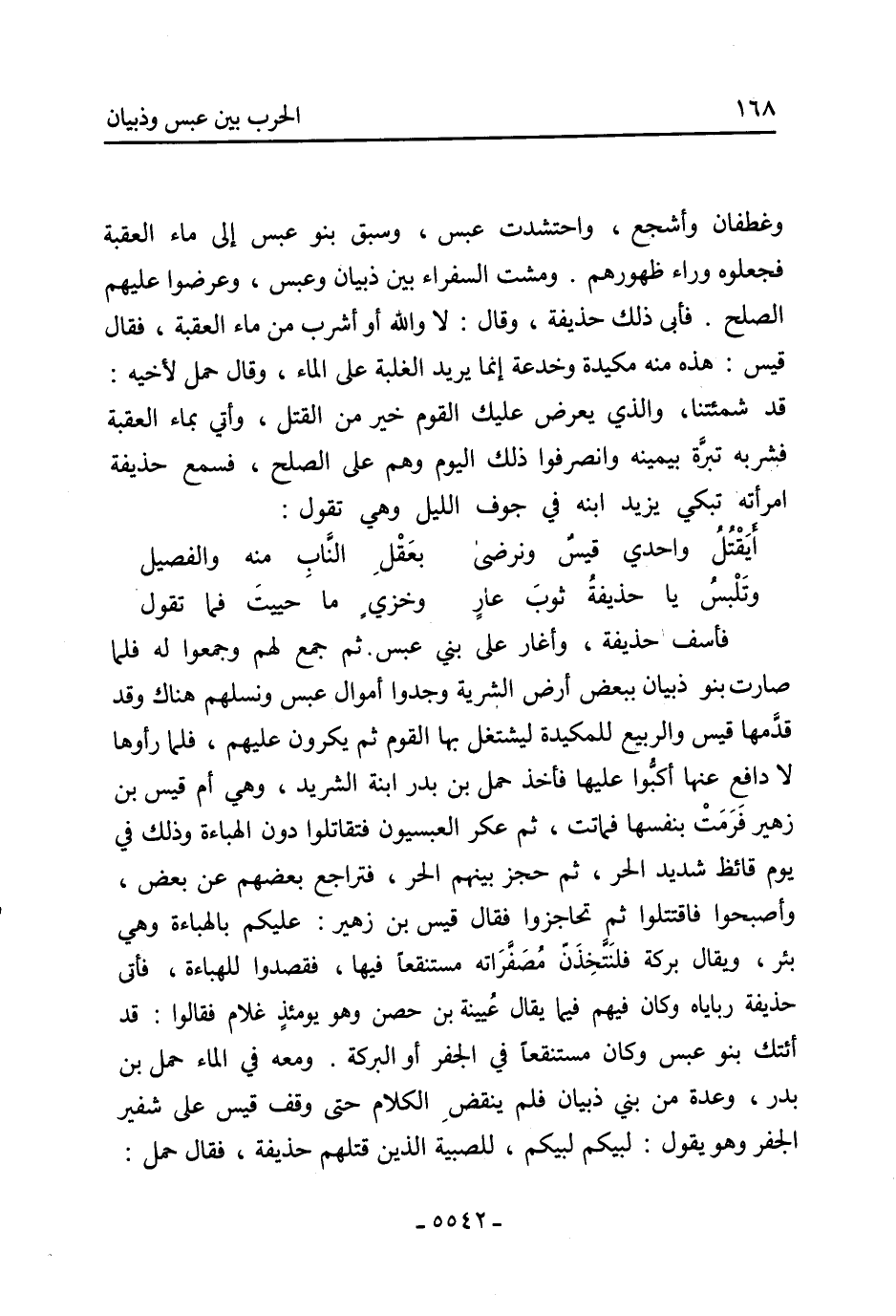 وغطفان وأشجع، واحتشدت عبس، وسبق بنو عبس إلى ماء العقبة فجعلوه وراء ظهورهم. ومشت السفراء بين ذبيان وعبس، وعرضوا عليهم الصلح. فأبى ذَلِكَ حذيفة، وقَالَ: لا والله أَوْ أشرب من ماء العقبة، فَقَالَ قيس: هَذِهِ مِنْهُ مكيدة وخدعة إنَّما يريد الغلبة عَلَى الماء، وقال حمل لأخيه: