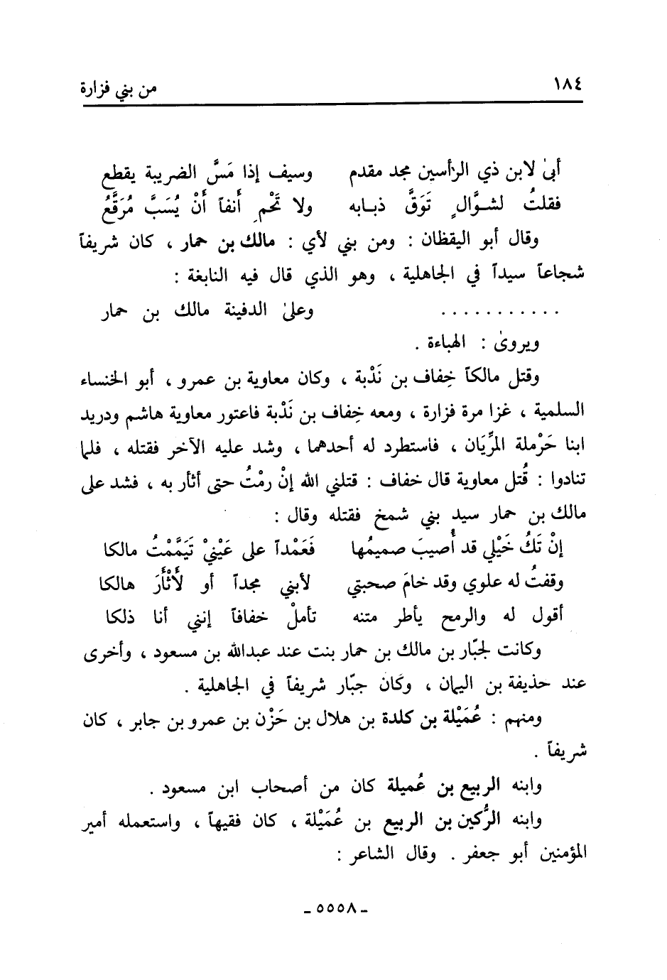 وقتل مالكًا خِفاف بْن نَدْبة، وكان معاوية بْن عَمْرو، أَبُو الخنساء السلمية، غزا مرة فزارة، ومعه خِفاف بْن نَدْبة فاعتور معاوية هاشم ودريد ابنا حَرْملة المرِّيَان، فاستطرد لَهُ أحدهما، وشد عَلَيْهِ الآخر فقتله، فلما تنادوا: قُتل معاوية قَالَ خفاف: قتلني اللَّه إنْ رمْتُ حتَّى أثأر بِهِ، فشد عَلَى مالك بْن حمار سيد بني شمخ فقتله وقَالَ: