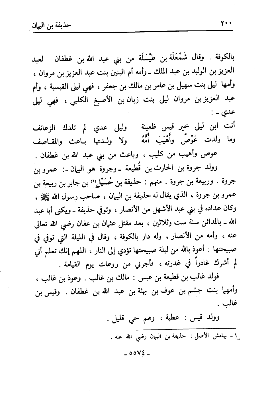 بالكوفة. وقَالَ شَمْعَلَة بْن طيْسَلَة من بني عَبْد اللَّه بْن غطفان لعبد العزيز بْن الوليد بْن عَبْد الملك- وأمه أم البنين بِنْت عَبْد العزيز بْن مروان، وأمها ليلى بِنْت سهيل بْن عامر بْن مالك بْن جعفر، فهي ليلى القيسية، وأم عَبْد العزيز بْن مروان ليلى بِنْت زبان بْن الأصبغ الكلبي، فهي ليلى عدي-: