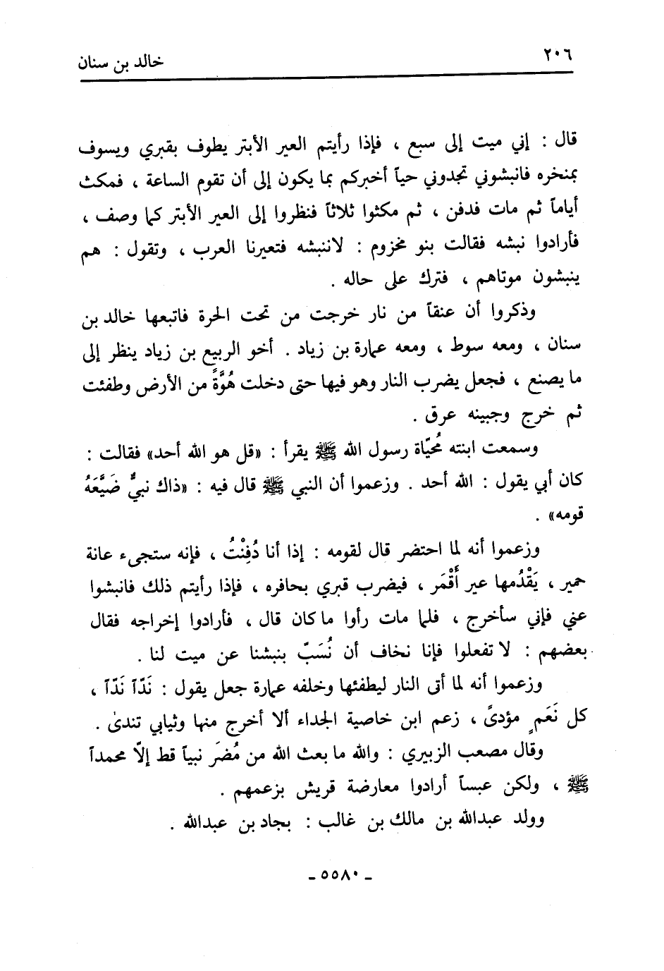 وذكروا أن عنقًا من نار خرجت من تحت الحرة فاتبعها خَالِد بْن سنان، ومعه سوط، ومعه عمارة بْن زياد. أخو الربيع بْن زياد ينظر إلى ما يصنع، فجعل يضرب النار وهو فيها حتَّى دخلت هُوَّةً من الأرض وطفئت ثُمَّ خرج وجبينه عرق.