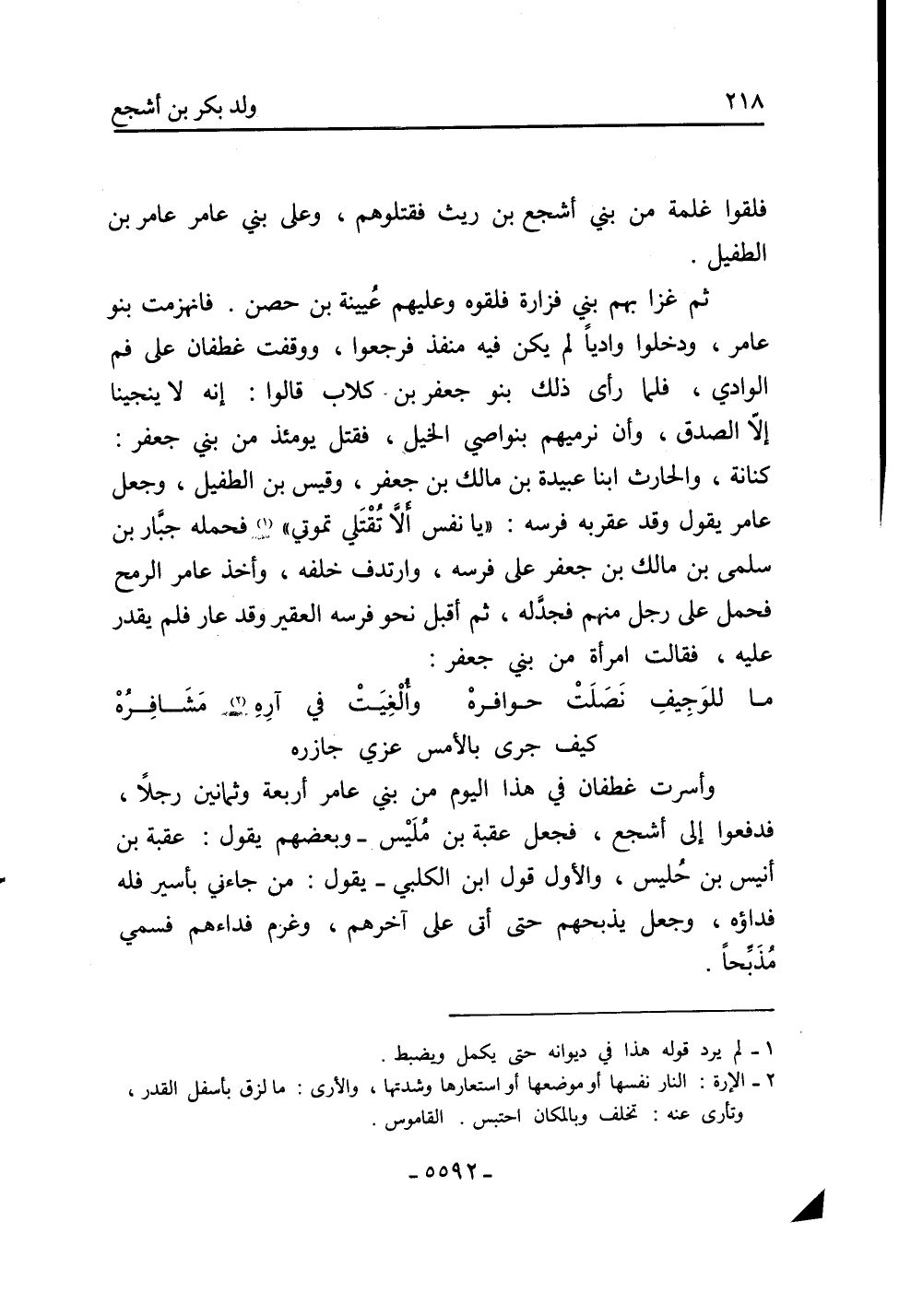 كنانة، والحارث ابنا عبيدة بْن مالك بْن جَعْفَر، وقيس بْن الطفيل، وجعل عامر يَقُولُ وَقَدْ عقربه فرسه: «يا نفس أَلَّا تُقْتَلي تموتي» [1] فحمله جبَّار بْن سلمى بْن مالك بْن جَعْفَر عَلَى فرسه، وارتدف خلفه، وأخذ عامر الرمح فحمل عَلَى رَجُل منهم فجدلَّه، ثُمَّ أقبل نحو فرسه العقير وَقَدْ عار فلم يقدر عَلَيْهِ، فقالت امْرَأَة من بني جَعْفَر: