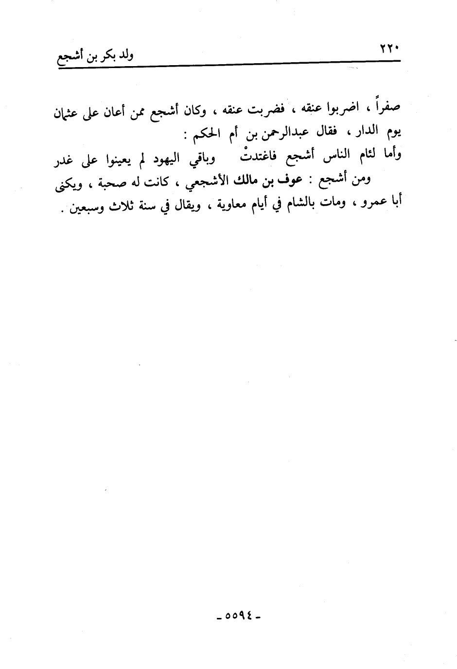 ومن أشجع: عوف بْن مالك الأشجعي، كانت لَهُ صحبة، ويكنى أبا عَمْرو، ومات بالشام فِي أيام معاوية، وَيُقَال فِي سنة ثلاث وسبعين.