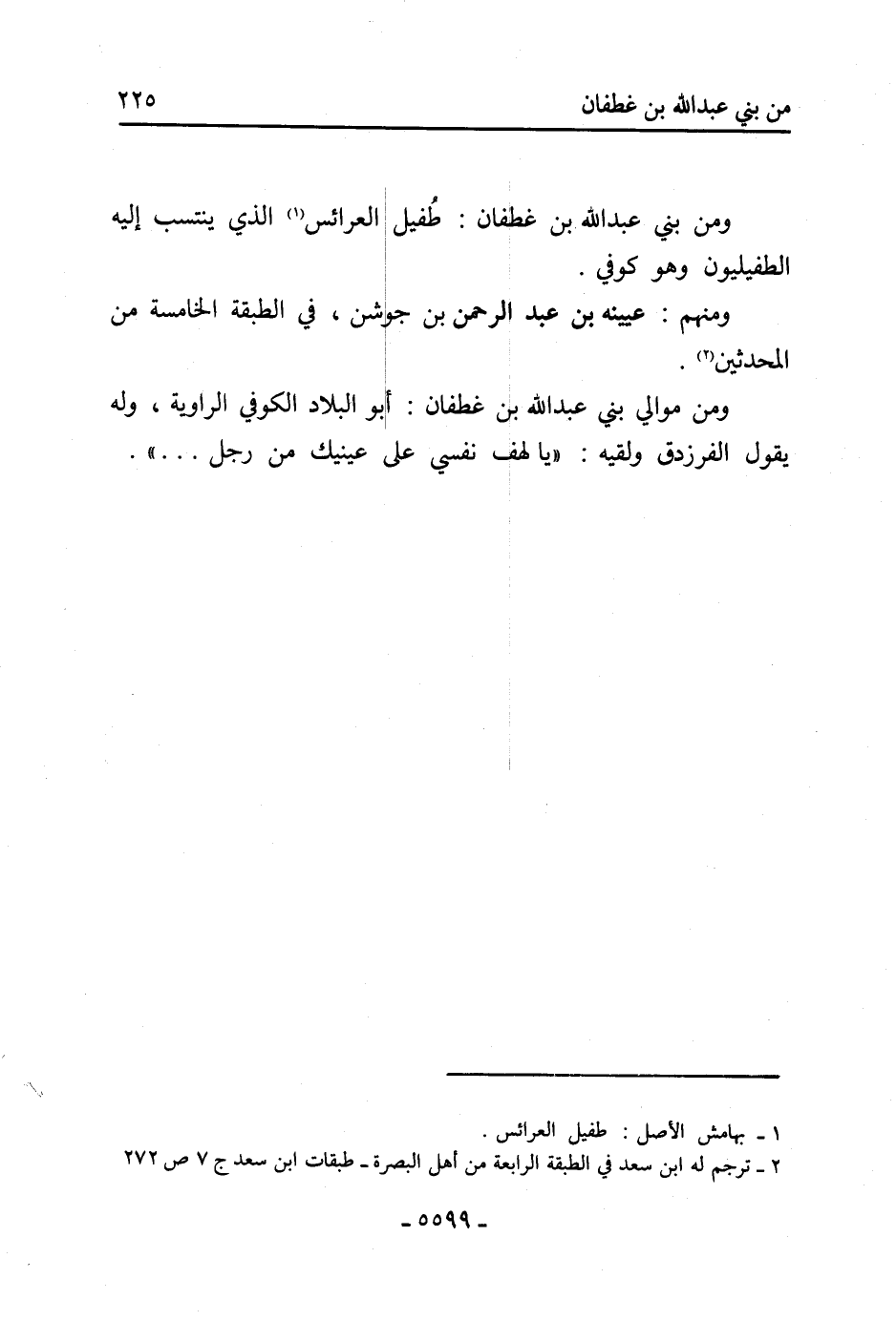 ومن بني عَبْد اللَّه بْن غطفان: طُفيل العرائس [1] الَّذِي ينتسب إِلَيْه الطفيليون وهو كوفي.