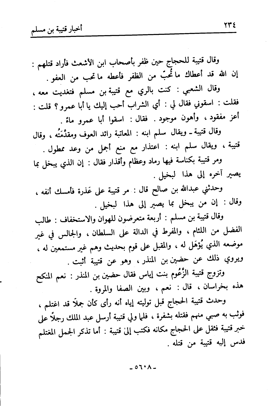 ومر قُتَيْبَة بكناسة فيها رماد وعظام وأقذار فَقَالَ: إن الَّذِي يبخل بما يصير آخره إلى هَذَا لبخيل.