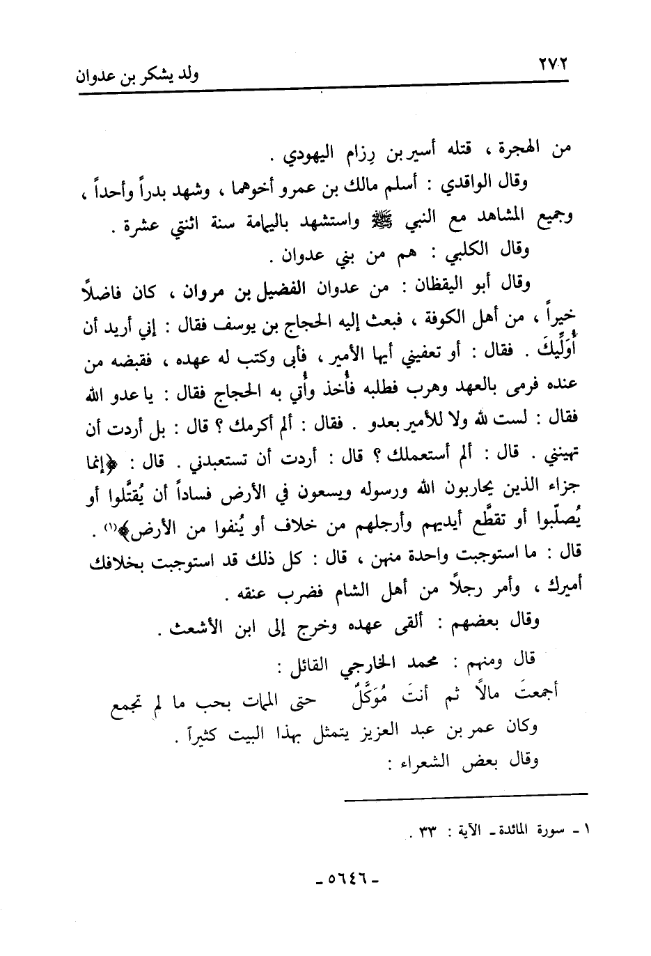وقَالَ أَبُو اليقظان: من عدوان الفضيل بْن مروان، كَانَ فاضلًا خيرًا، من أهل الكوفة، فبعث إِلَيْه الحجاج بْن يُوسُف فَقَالَ: إني أريد أن أُوَلِّيكَ. فَقَالَ: أَوْ تعفيني أيها الأمير، فأبى وكتب لَهُ عهده، فقبضه من عنده فرمى بالعهد وهرب فطلبه فأُخذ وأُتي بِهِ الحجاج فَقَالَ: يا عدو اللَّه فَقَالَ: لست لله ولا للأمير بعدو. فَقَالَ: ألم أكرمك؟ قَالَ: بل أردت أن تهينني. قَالَ: ألم أستعملك؟ قَالَ: أردت أن تستعبدني. قَالَ: إِنَّمَا جَزَاءُ الَّذِينَ يُحَارِبُونَ اللَّهَ وَرَسُولَهُ وَيَسْعَوْنَ فِي الأَرْضِ فَسَادًا أَنْ يُقَتَّلُوا أَوْ يُصَلَّبُوا أَوْ تُقَطَّعَ أَيْدِيهِمْ وَأَرْجُلُهُمْ مِنْ خِلافٍ أَوْ ينفوا من الأرض [1] .