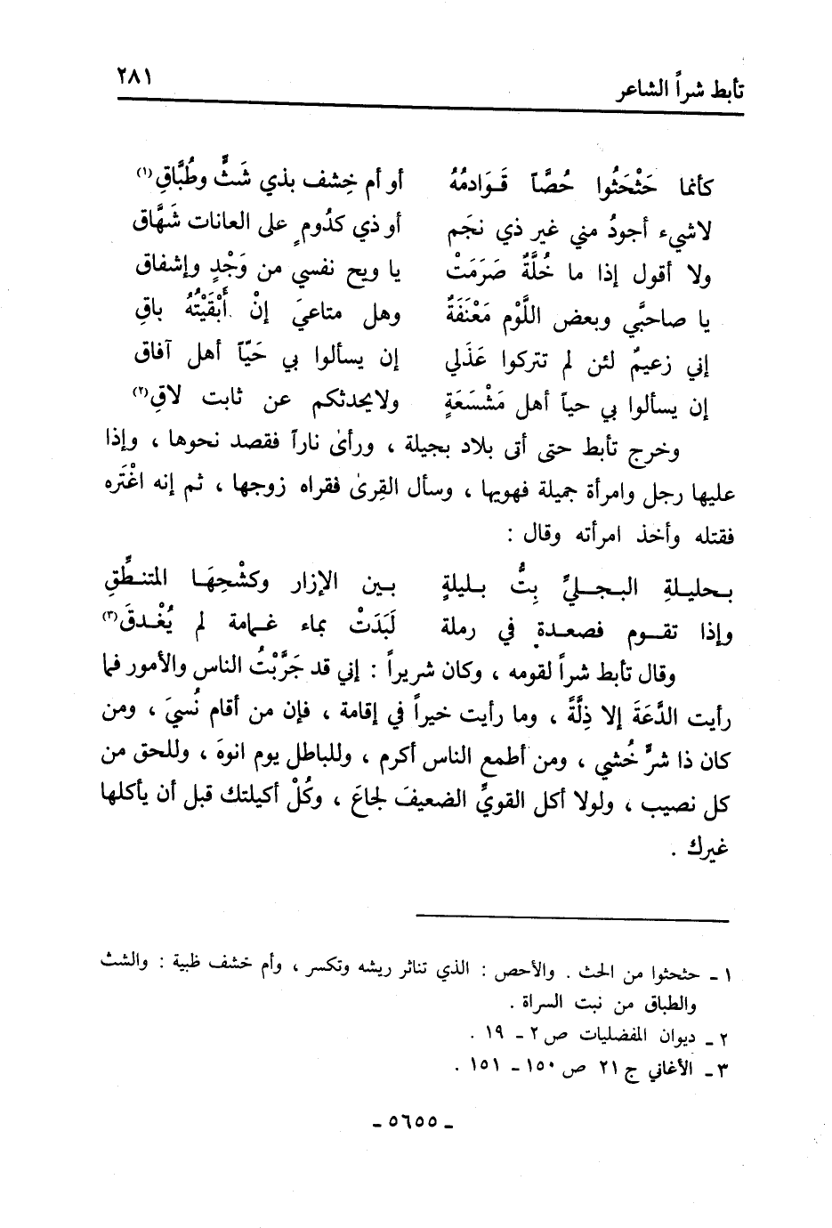 وقَالَ تأبط شرًا لقومه، وكان شريرًا: إني قَدْ جَرَّبْتُ النَّاس والأمور فما رَأَيْت الدَّعَةَ إلا ذِلَّةً، وما رَأَيْت خيرًا فِي إقامة، فإن من أقام نُسيَ، ومن كَانَ ذا شرٍّ خُشي، ومن أطمع النَّاس أكرم، وللباطل يوم انوه، وللحق من كل نصيب، ولولا أكل القويِّ الضعيفَ لجاعَ، وكُلْ أكيلتك قبل أن يأكلها غيرك.