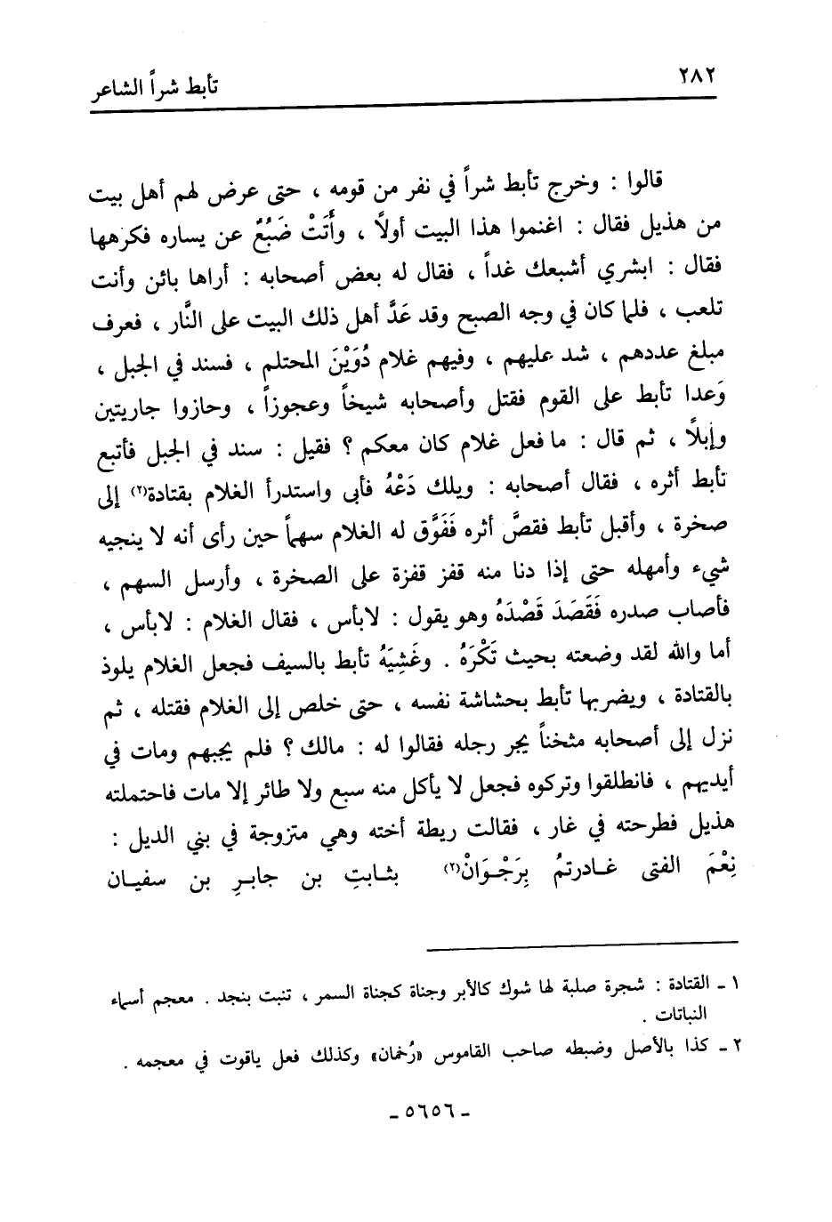 قَالُوا: وخرج تأبط شرًا فِي نفر من قومه، حتَّى عرض لهم أهل بيت من هذيل فَقَالَ: اغنموا هَذَا البيت أولًا، وأَتَتْ ضَبُعٌ عن يساره فكرهها فَقَالَ: أبشري أشبعك غدًا، فَقَالَ لَهُ بعض أصحابه: أراها بائن وأنت تلعب، فلما كَانَ فِي وجه الصبح وَقَدْ عَدَّ أهل ذَلِكَ البيت عَلَى النَّار، فعرف مبلغ عددهم، شد عليهم، وفيهم غلام دُوَيْنَ المحتلم، فسند فِي الجبل، وَعدا تأبط عَلَى القوم فقتل وأصحابه شيخًا وعجوزًا، وحازوا جاريتين وإبلًا، ثُمَّ قَالَ: ما فعل غلام كَانَ معكم؟ فقيل: سند فِي الجبل فاتبع تأبط أثره، فَقَالَ أصحابه: ويلك دَعْهُ فأبى واستدرأ الغلام بقتادة [1] إلى صخرة، وأقبل تأبط فقصَّ أثره فَفَوَّق لَهُ الغلام سهمًا حين رَأَى أَنَّهُ لا ينجيه شيء وأمهله حتَّى إِذَا دنا مِنْهُ قفز قفزة عَلَى الصخرة، وأرسل السهم، فأصاب صدره فَقَصَدَ قَصْدَهُ وهو يَقُولُ: لا بأس، فَقَالَ الغلام: لا بأس، أما والله لقد وضعته بحيث تَكْرَهُ. وغَشِيَهُ تأبط بالسيف فجعل الغلام يلوذ بالقتادة، ويضربها تأبط بحشاشة نفسه، حتَّى خلص إلى الغلام فقتله، ثُمَّ نزل إلى أصحابه مثخنا يجر رجله فقالوا له: مالك؟ فلم يجبهم ومات في أيديهم، فانطلقوا وتركوه فجعل لا يأكل مِنْهُ سبع ولا طائر إلا مات فاحتملته هذيل فطرحته في غار، فقالت ريطة أخته وهي متزوجة فِي بني الديل: