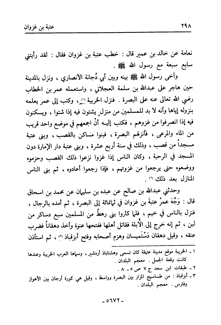 وَحَدَّثَنِي عَبْدُ اللَّهِ بْنُ صَالِحٍ عَنْ عَبْدَةَ بْنِ سُلَيْمَانَ عَنْ مُحَمَّدِ بْنِ إِسْحَاقَ قَالَ: وَجَّهَ عُمَرُ عُتْبَةَ بْنَ غَزْوَانَ فِي ثمانمائة إِلَى الْبَصْرَةِ، ثُمَّ أَمَدَّهُ بِالرِّجَالِ، فَنَزَلَ بِالنَّاسِ فِي خَيْمٍ، فَلَمَّا كَثَرُوا بَنَي رَهْطٌ مِنَ الْمُسْلِمِينَ سَبْعَ دَسَاكِرَ مِنْ لَبِنٍ، ثُمَّ إِنَّهُ خَرَجَ إِلَى الأُبُلَّةِ فَقَاتَلَ أَهْلَهَا فَفَتَحَهَا عُنْوَةً وَأَخَذَ دِهْقَانًا فَضَرَبَ عُنُقَهُ، وَقِيلَ دِهْقَانُ دَسْتَمَيْسَانَ وهزم أصحابه وفتح أبزقباذ [3] ، ثم استأذن