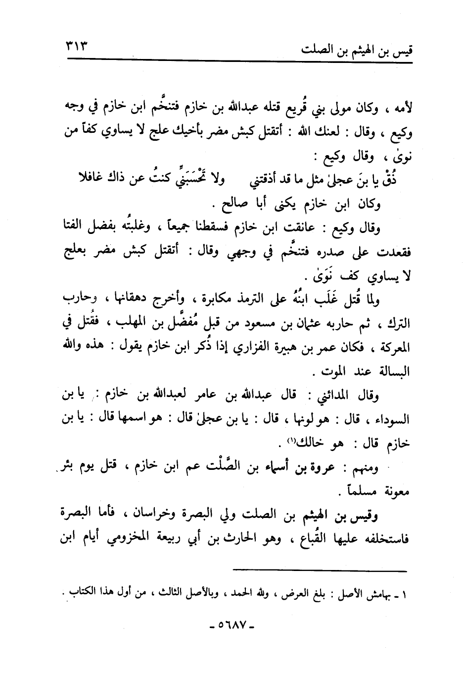 وقَالَ وكيع: عانقت ابْنُ خازم فسقطنا جميعا، وغلبته بفضل الفتاء فقعدت عَلَى صدره فتنخَّم فِي وجهي وقَالَ: أتقتل كبش مضر بعلج لا يساوي كف نَوَى.