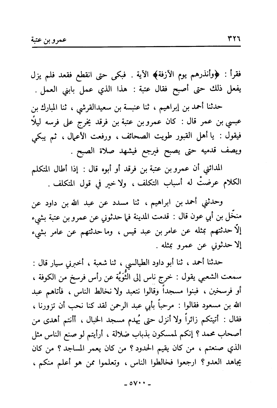 حَدَّثَنَا أَحْمَد بْن إِبْرَاهِيم، ثنا عنبسة بن سعيد الْقُرَشِيّ، ثنا المبارك بْن عبسي بْن عُمَر قَالَ: كَانَ عَمْرو بْن عتبة بْن فرقد يخرج عَلَى فرسه ليلًا فيقول: يا أهل القبور طويت الصحائف، ورفعت الأعمال، ثُمَّ يبكي ويصف قدميه حتَّى يصبح فيرجع فيشهد صلاة الصبح.