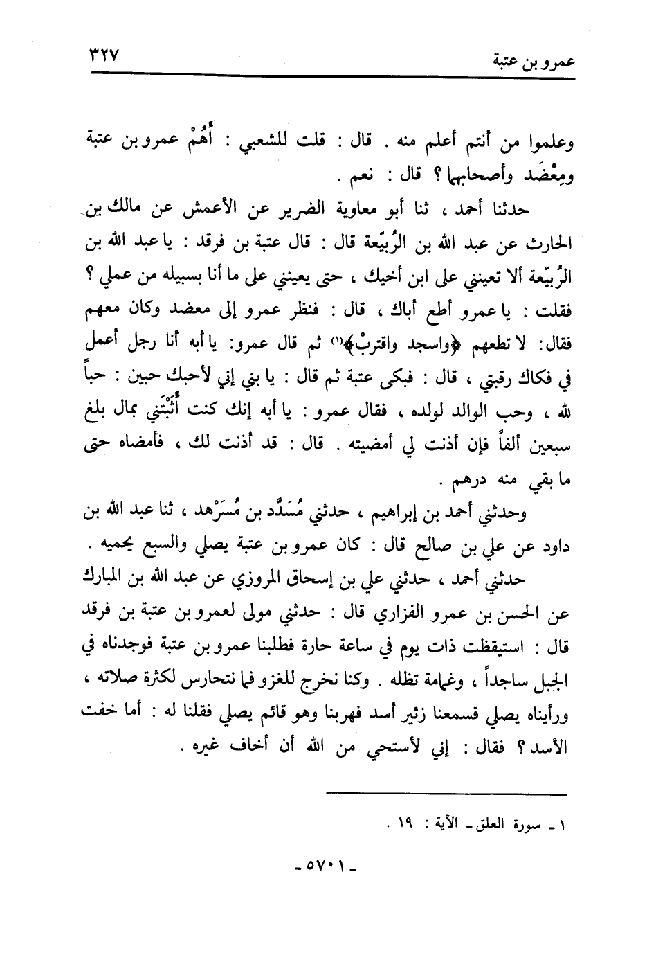 حَدَّثَنِي أَحْمَد، حَدَّثَنِي عليّ بْن إِسْحَاق المروزي عَن عَبْد اللَّهِ بْن المبارك عَن الْحَسَن بْن عَمْرو الفزاري قَالَ: حَدَّثَنِي مَوْلَى لعمرو بْن عتبة بْن فرقد قَالَ: استيقظت ذات يَوْم فِي ساعة حارة فطلبنا عَمْرو بْن عتبة فوجدناه فِي الجبل ساجدًا، وغمامة تظله. وكنا نخرج للغزو فما نتحارس لكثرة صلاته، ورأيناه يصلي فسمعنا زئير أسد فهربنا وهو قائم يصلي فقلنا لَهُ: أَما خفت الأسد؟ فقال: إني لأستحي من الله أن أخاف غيره.