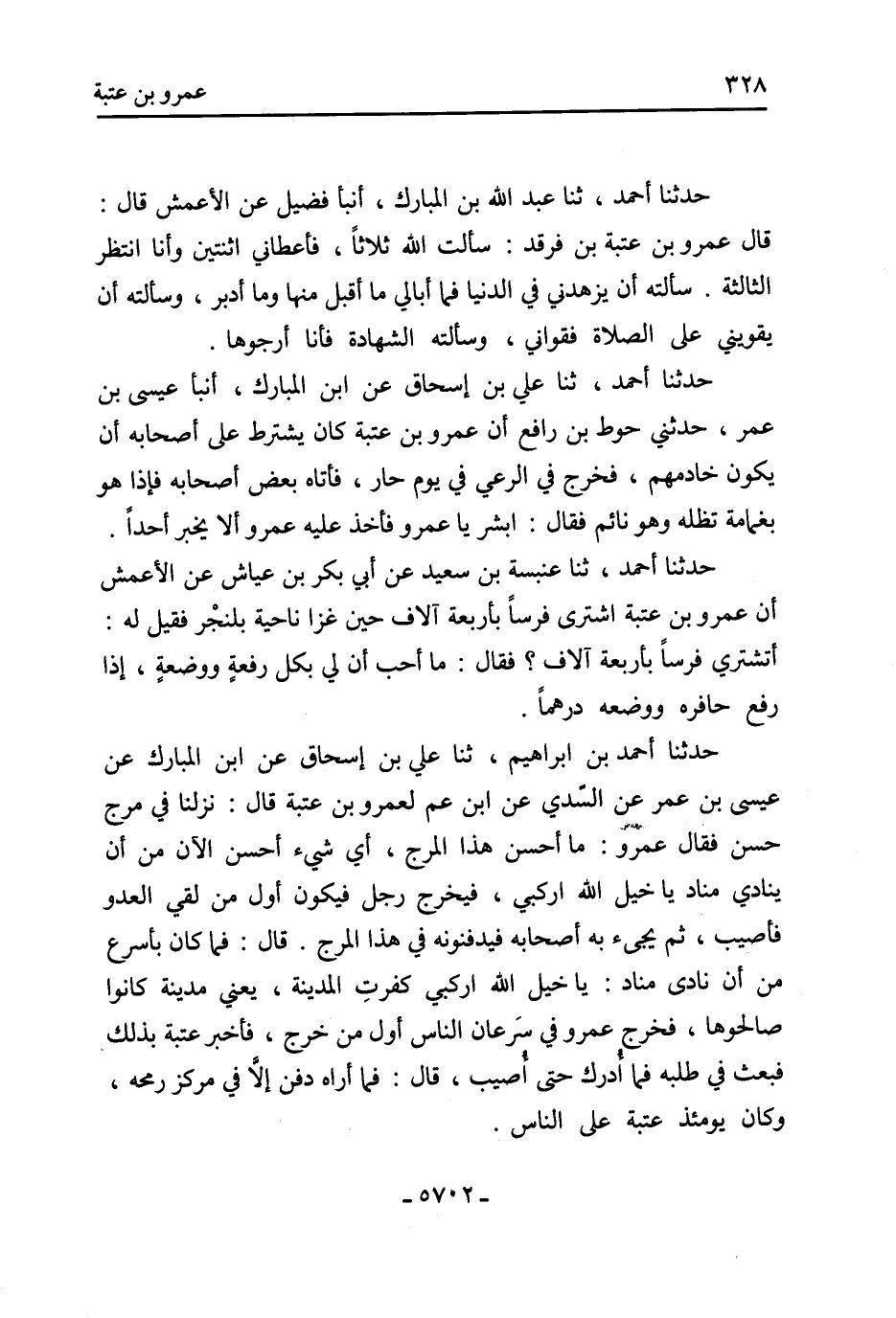 حَدَّثَنَا أَحْمَد، ثنا عنبسة بْن سَعِيد عَن أَبِي بَكْر بْن عياش عَن الْأَعْمَش أن عمرو بْن عتبة اشترى فرسًا بأربعة آلاف حين غزا ناحية بلنجْر فقيل لَهُ: