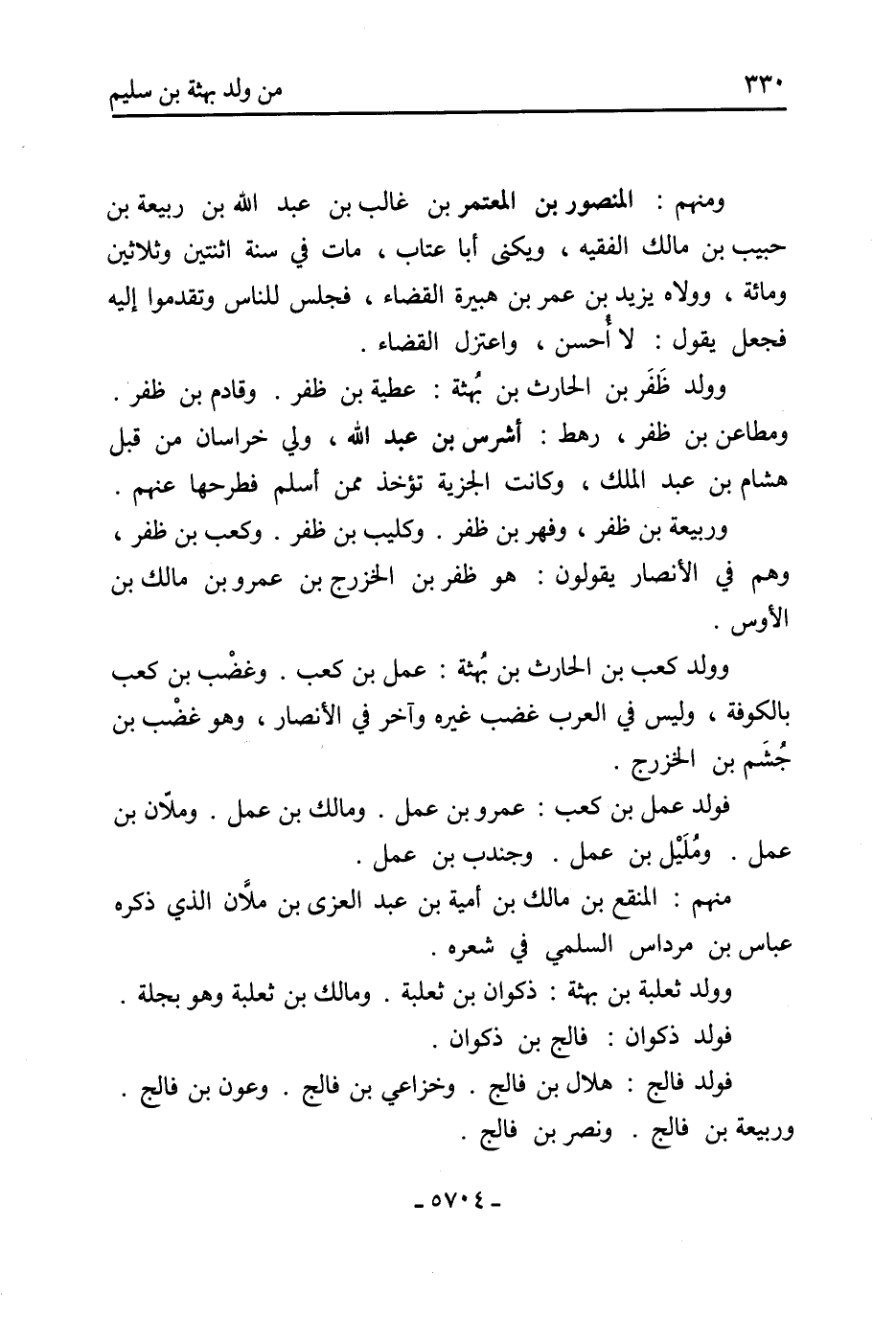 ومنهم: المنصور بْن المعتمر بْن غالب بْن عَبْد اللَّه بْن ربيعة بْن حبيب بْن مالك الفقيه، ويكنى أبا عتاب،