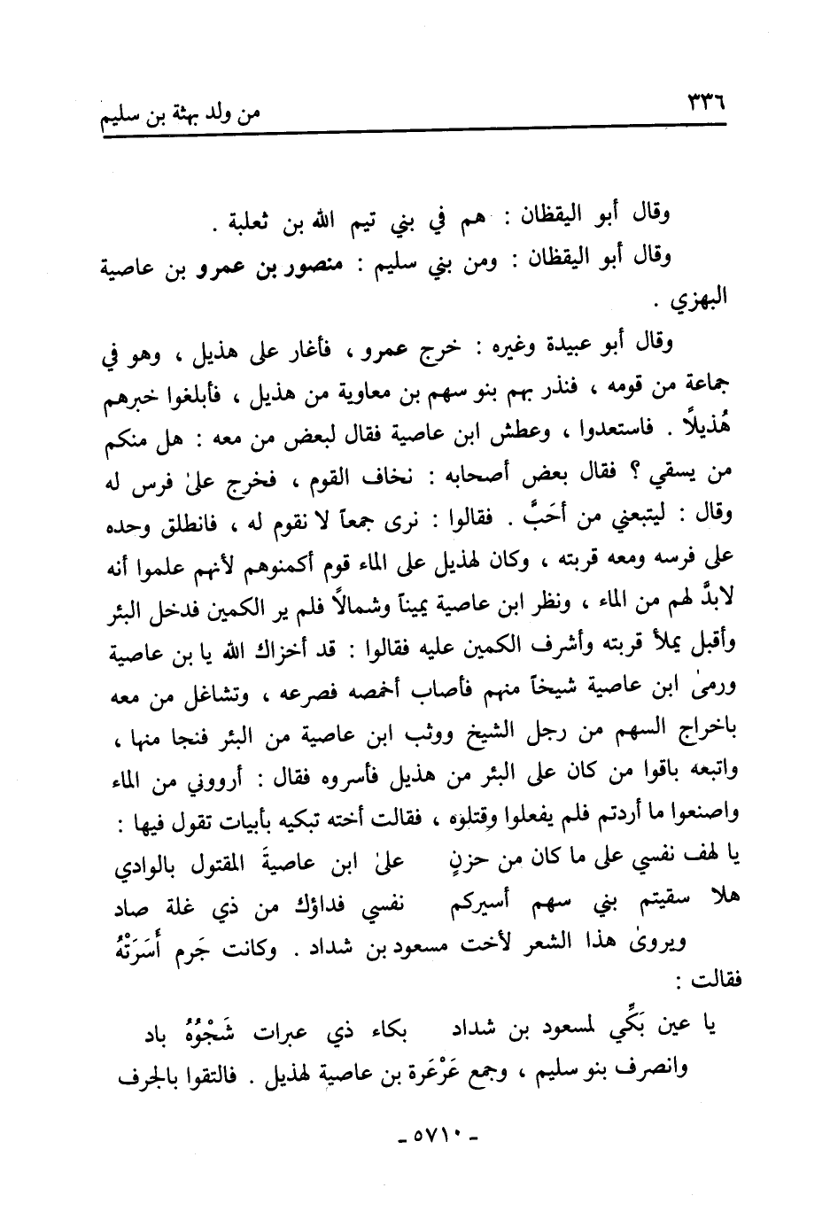 وقَالَ أَبُو عبيدة وغيره: خرج عمرو، فأغار عَلَى هذيل، وهو فِي جماعة من قومه، فنذر بهم بنو سهم بْن معاوية بن هذيل، فأبلغوا خبرهم هذيلا. فاستعدوا، وعطش ابن عاصية فَقَالَ لبعض من معه: هَلْ منكم من يسقي؟ فَقَالَ بعض أصحابه: نخاف القوم، فخرج عَلَى فرس لَهُ وقَالَ: ليتبعني من أحَبَّ. فقالوا: نرى جمعًا لا نقوم لَهُ، فانطلق وحده عَلَى فرسه ومعه قربته، وكان لهذيل عَلَى الماء قوم أكمنوهم لأنهم علموا أنه لا بدّ لهم من الماء، ونظر ابْنُ عاصية يمينا وشمالا فلم ير الكمين فدخل البئر وأقبل يملأ قربته وأشرف الكمين عليه فقالوا: قد أخزاك الله يابن عاصية ورمى ابن عاصية شيخًا منهم فأصاب أخمصه فصرعه، وتشاغل من معه بإخراج السهم من رَجُل الشَّيْخ ووثب ابن عاصية من البئر فنجا مِنْها، واتبعه باقوا من كَانَ عَلَى البئر من هذيل فأسروه فَقَالَ: أرووني من الماء واصنعوا ما أردتم فلم يفعلوا وقتلوه، فقالت أخته تبكيه بأبيات تَقُولُ فيها: