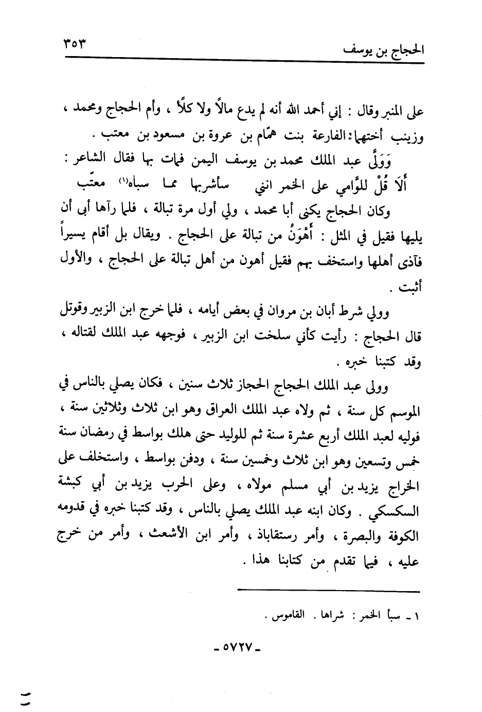 وكان الحجاج يكنى أبا مُحَمَّد، ولي أول مرة تبالة، فلما رآها أَبى أن يليها فقيل فِي المثل: أهْوَنُ من تبالة عَلَى الحجاج. وَيُقَال بل أقام يسيرًا فآذى أهلها واستخف بهم فقيل أهون من أهل تبالة عَلَى الحجاج، والأول أثبت.
