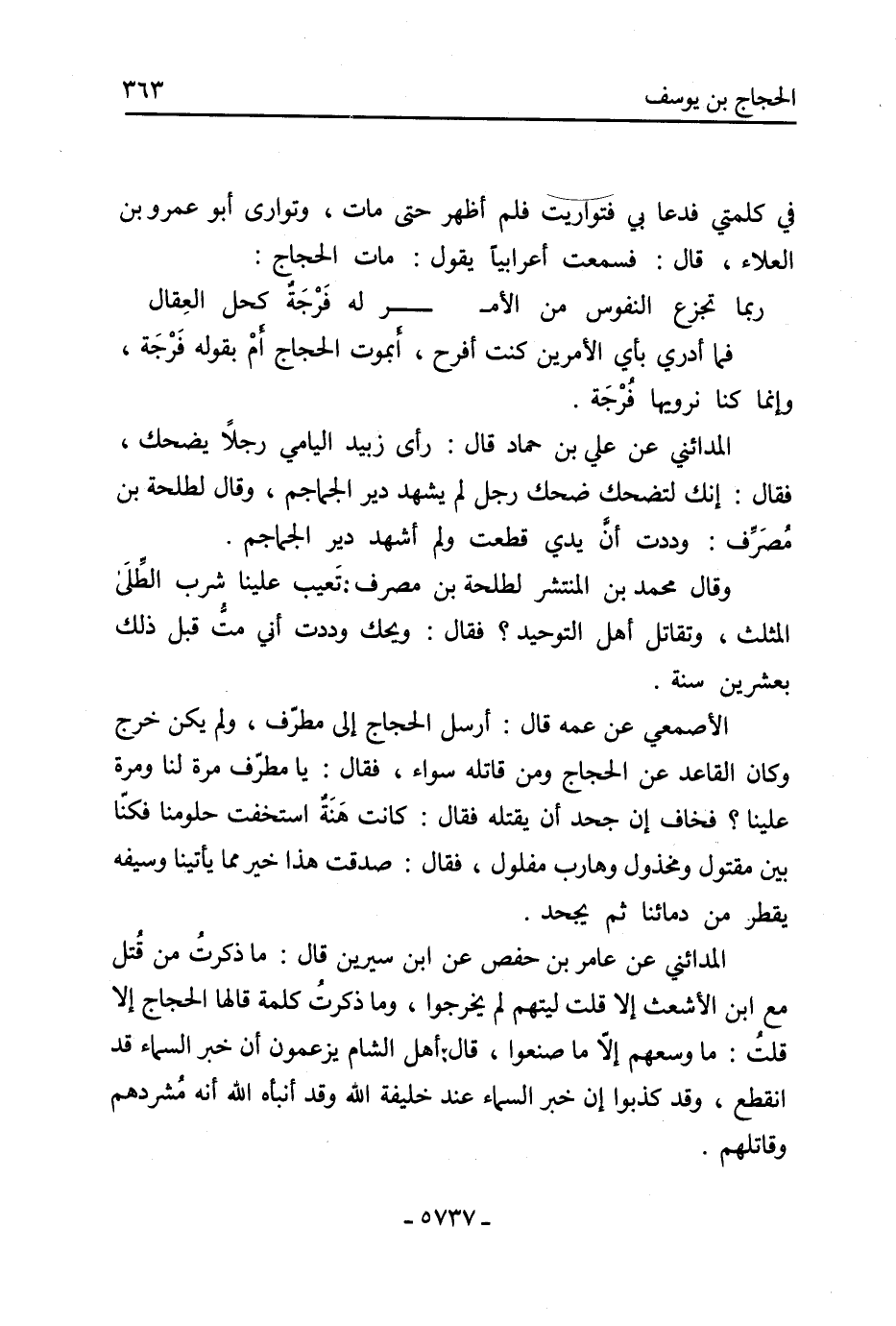 فِي كلمتي فدعا بي فتواريت فلم أظهر حتَّى مات، وتوارى أَبُو عَمْرو بْن العلاء، قَالَ: فسمعت أعرابيًا يَقُولُ: مات الحجاج:
