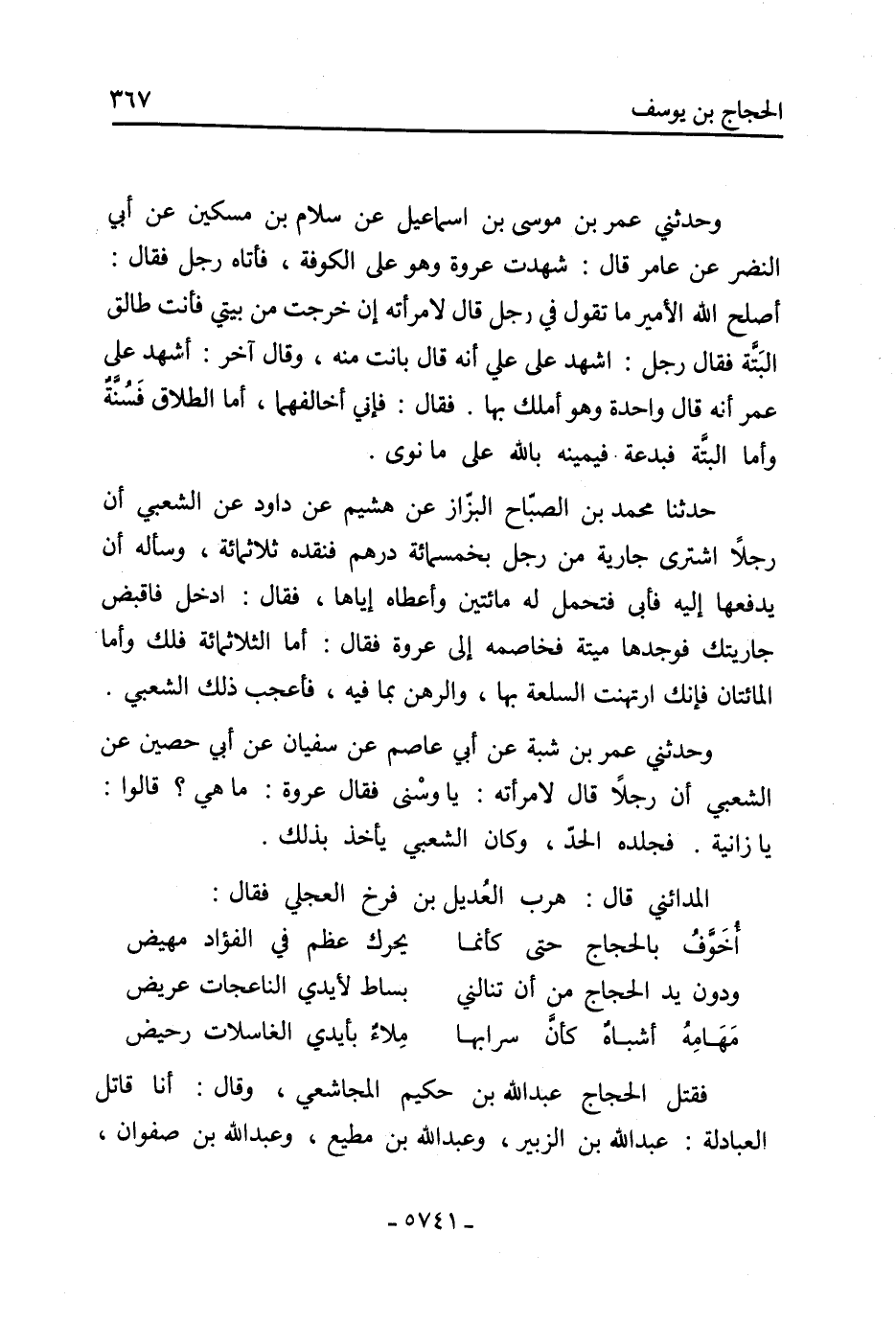 وحدَّثني عُمَر بْن مُوسَى بْن إِسْمَاعِيل عن سلام بْن مسكين عن أَبِي النضر عن عامر قَالَ: شهدت عروة وهو عَلَى الكوفة، فأتاه رَجُل فَقَالَ: