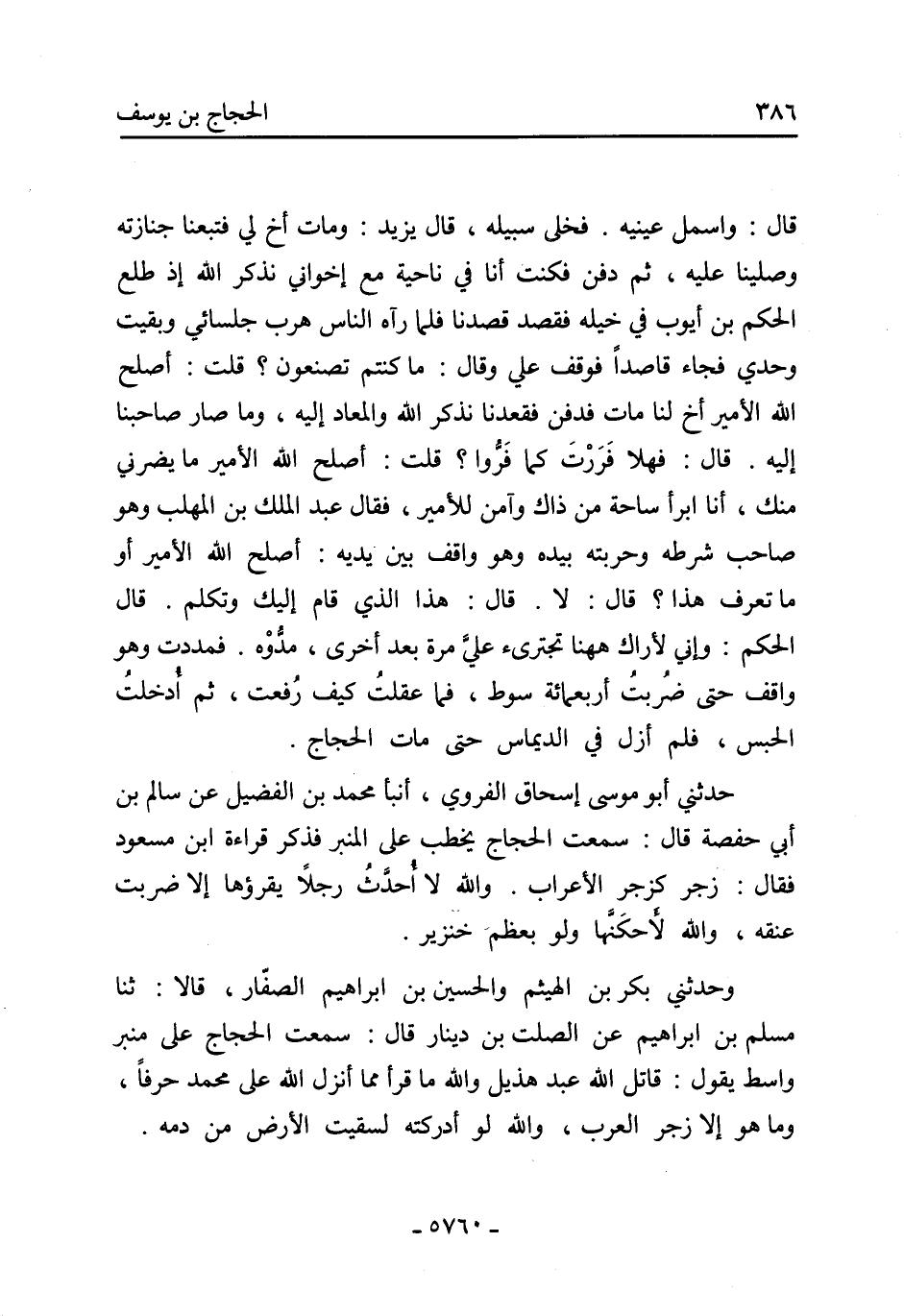 حَدَّثَنِي أَبُو مُوسَى إِسْحَاق الفروي، أنبأ مُحَمَّد بْن الفضيل عن سالم بْن أَبِي حفصة قَالَ: سَمِعْتُ الحجاج يخطب عَلَى المنبر فذكر قراءة ابْنُ مَسْعُود فَقَالَ: زجر كزجر الأعراب. والله لا أُحدَّثُ رجلًا يقرؤها إلا ضربت عنقه، والله لَأحكَنَّها ولو بعظم خنزير.
